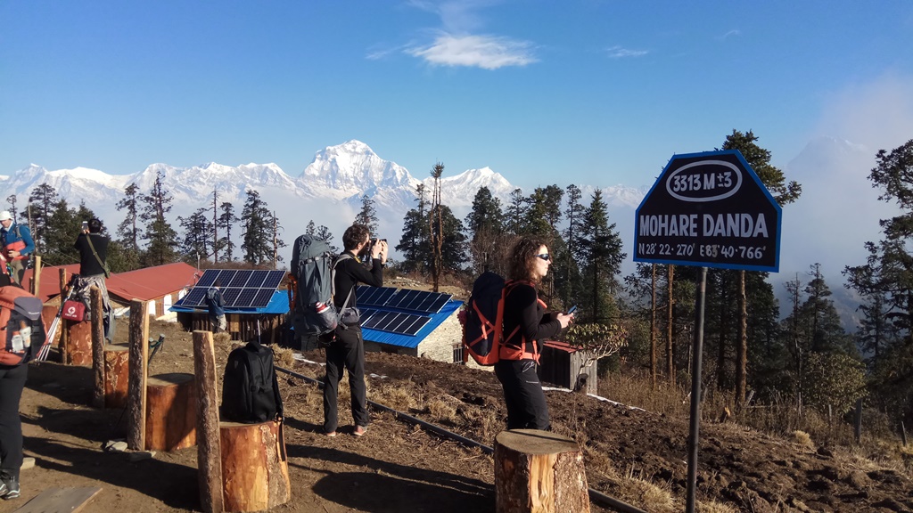 Here on, it’s all the way up. A four-hour trek uphill from Nagi Gaun takes one to Mohare Danda (3,300 metres) through Dhimi Danda. Mohare Danda provides an excellent view of the famed Annapurna-Dhaulagiri Mountain Range, while also making a vantage point to watch the sunrise and sunset. Mohare is also noted for its diverse fauna, especially birds, a perfect venue for ornithology students. Among several endangered species of birds, the usual suspects like Dafne, Monal and Kalij rule the forests here.