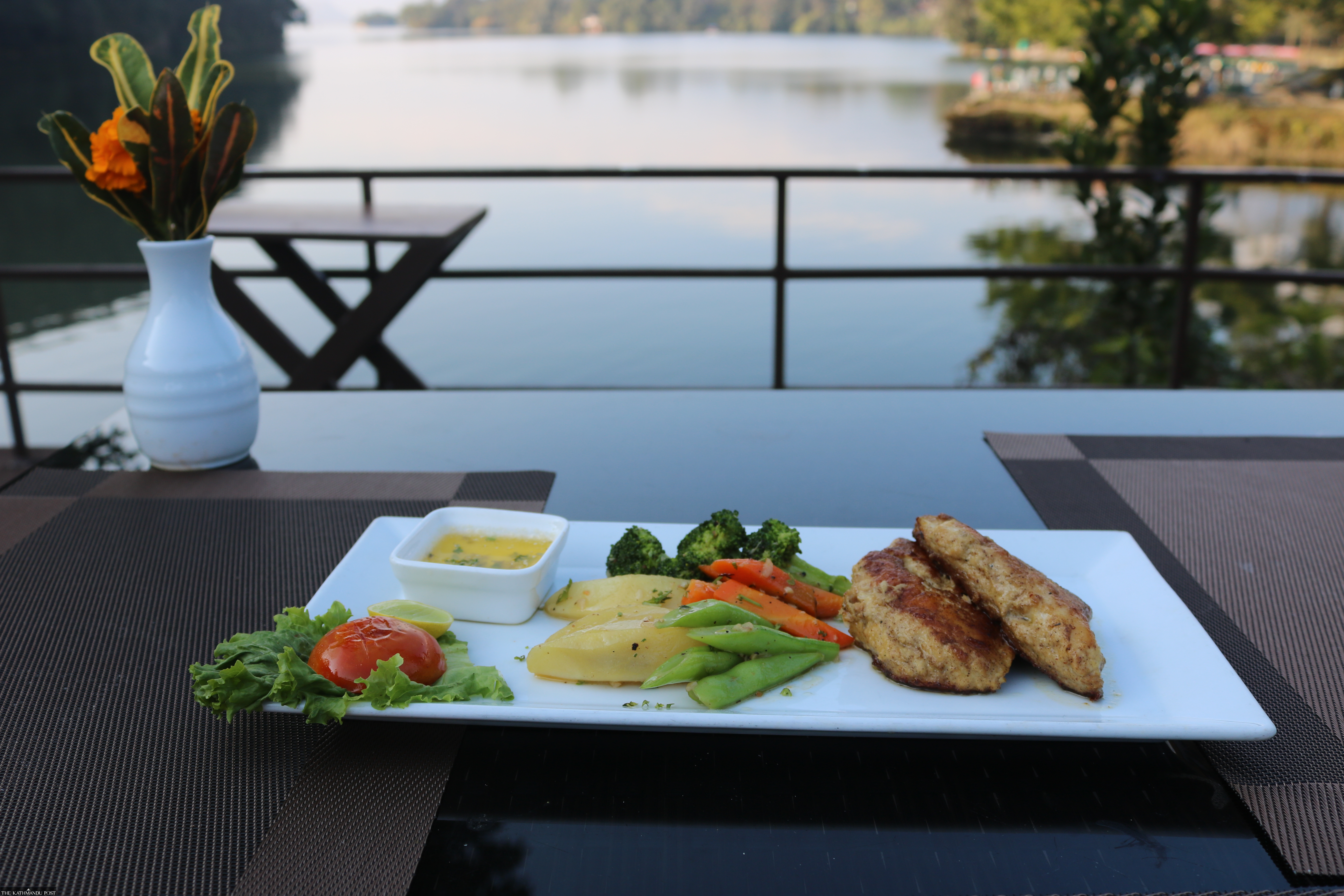 There are buffets available for breakfast, lunch, and dinner with timings depending upon the occupancy but I went with continental cuisine for lunch. Starting off with cream of mushroom soup, the bar was set high as the soup achieved a balance with just the right amount of creaminess not overpowering the taste of the mushrooms. The Chicken Caesar salad was fresh and tasty with a combination of shredded lettuce, croutons, seared chicken pieces, and cheese. I am usually averse to seafood yet with the mindset of ‘when in Rome, do as the Romans do’, I settled on grilled fish for the main course as the Phewa Lake on the side of the deck glistened under the afternoon sun. The grilled fish was the main highlight of my meals at Fish Tail Lodge: the perfectly cooked fish packed a punch of flavours with each bite and I had second thoughts about my reservations with seafood. The lunch ended with a slice of apple pie alongside a generous dollop of ice cream which satisfied the inner child in me.