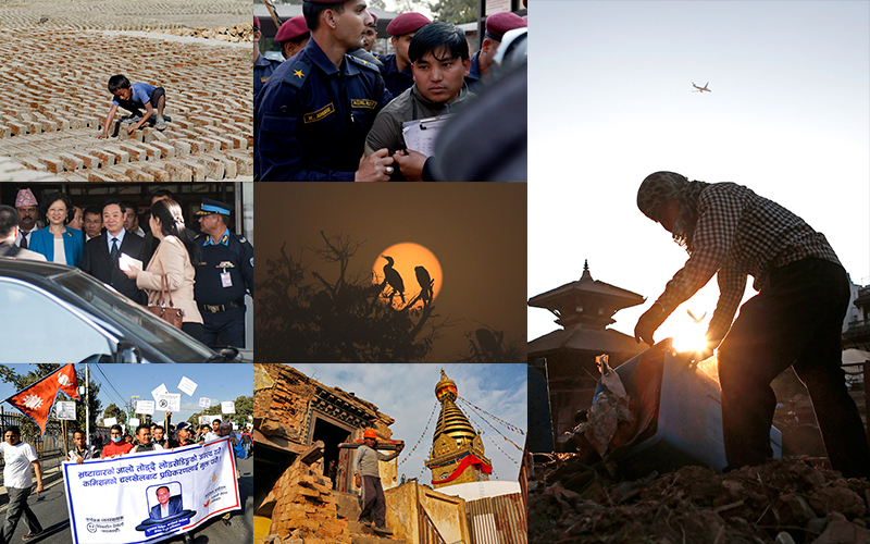 Dec 22: A worker carries debris as they demolish a Buddhist monastery which was damaged during last year's massive earthquake in the Capital. Photo: Sanjog Manandhar
