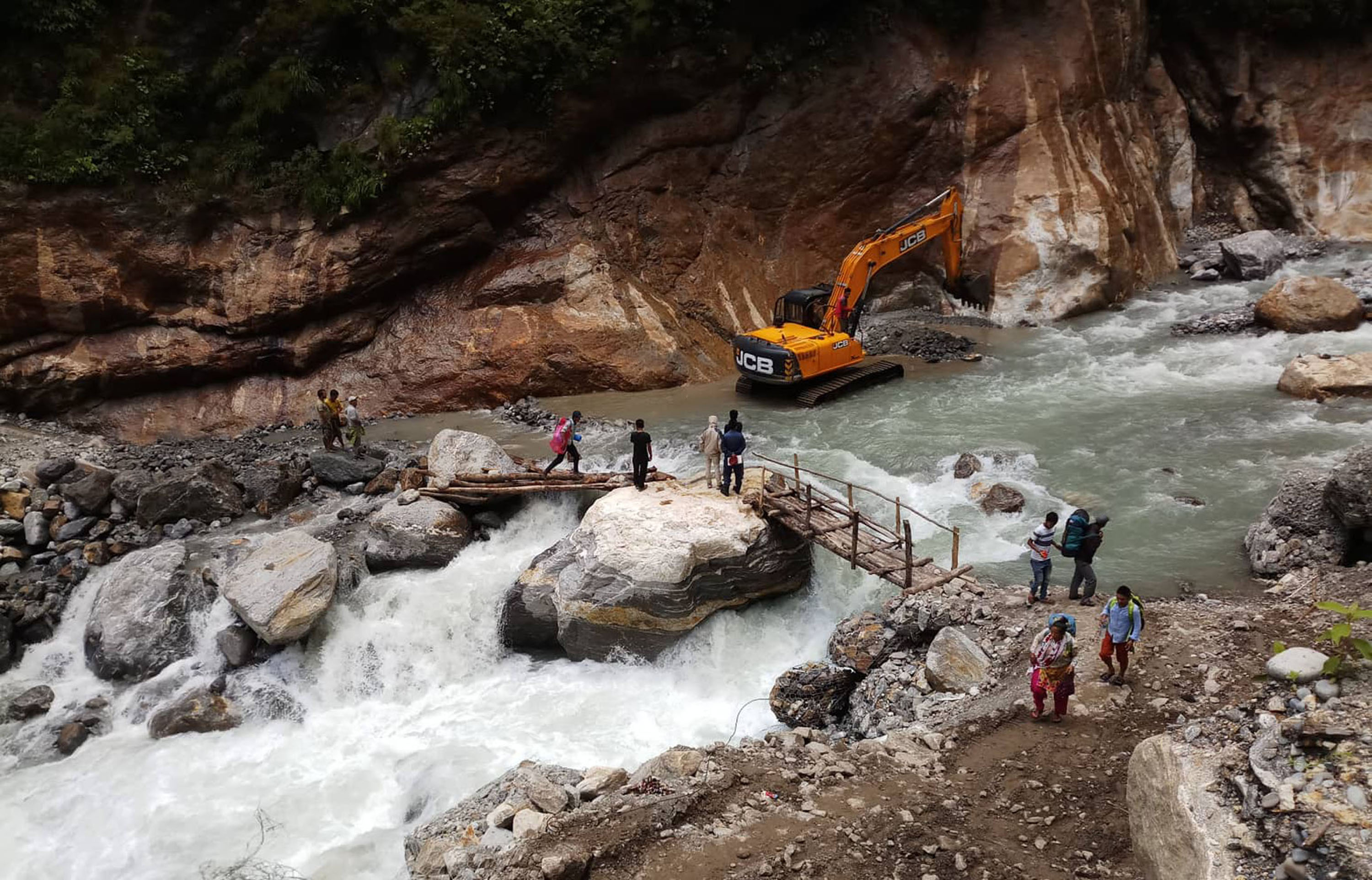People use wooden planks to cross the Myardiriver that borders Lamjung and Manang. The absence of bridge has taken a toll on the daily life of locals. Aash Gurung/TKP