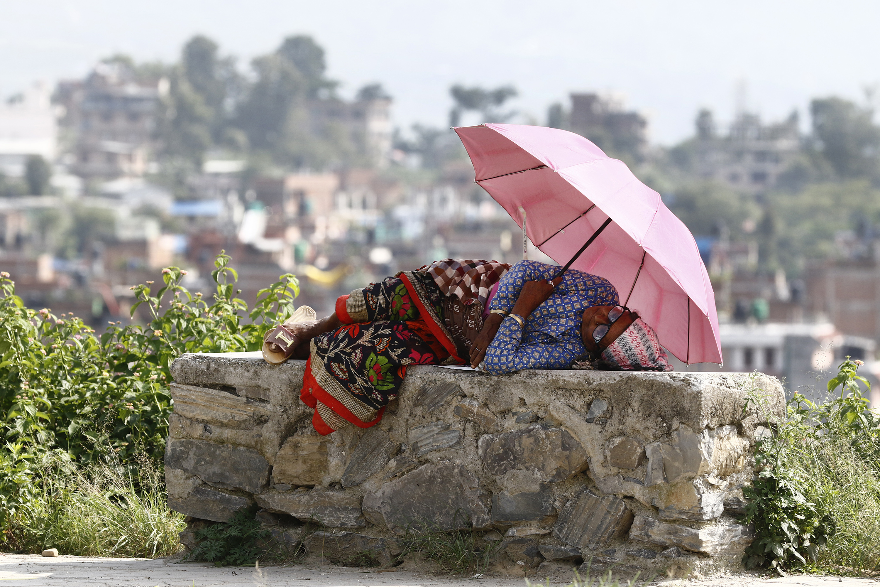 A woman takes a nap while holding an umbrella to shield herself from the sun near a park in Bungamati, Lalitpur, on Tuesday. Keshav Thapa/TKP
