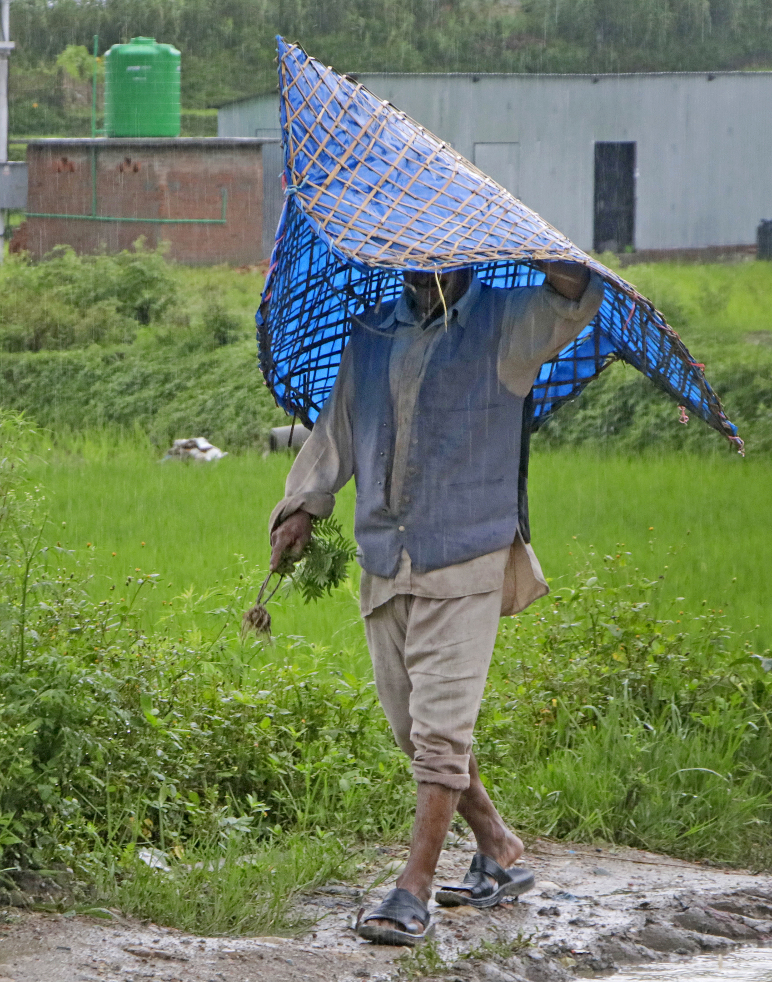 A farmer shields himself from the rain as he returns from paddy fields in Khokana, Lalitpur. Anish Regmi/TKP