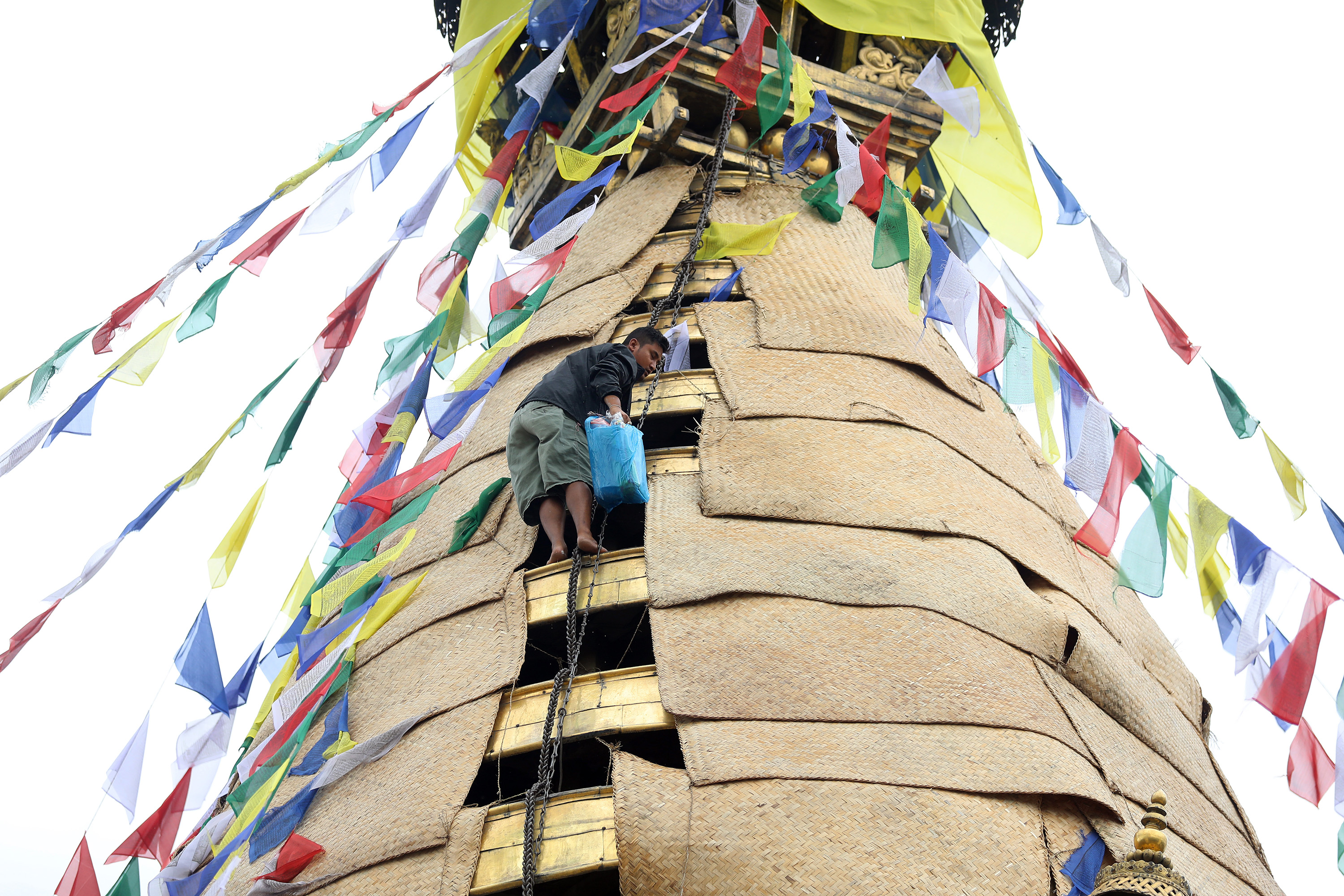 A devotee sets up prayer flags around the SwayambhunathStupa in Kathmandu on Thursday. The ritual is usually done during a full moon day. Elite Joshi/TKP