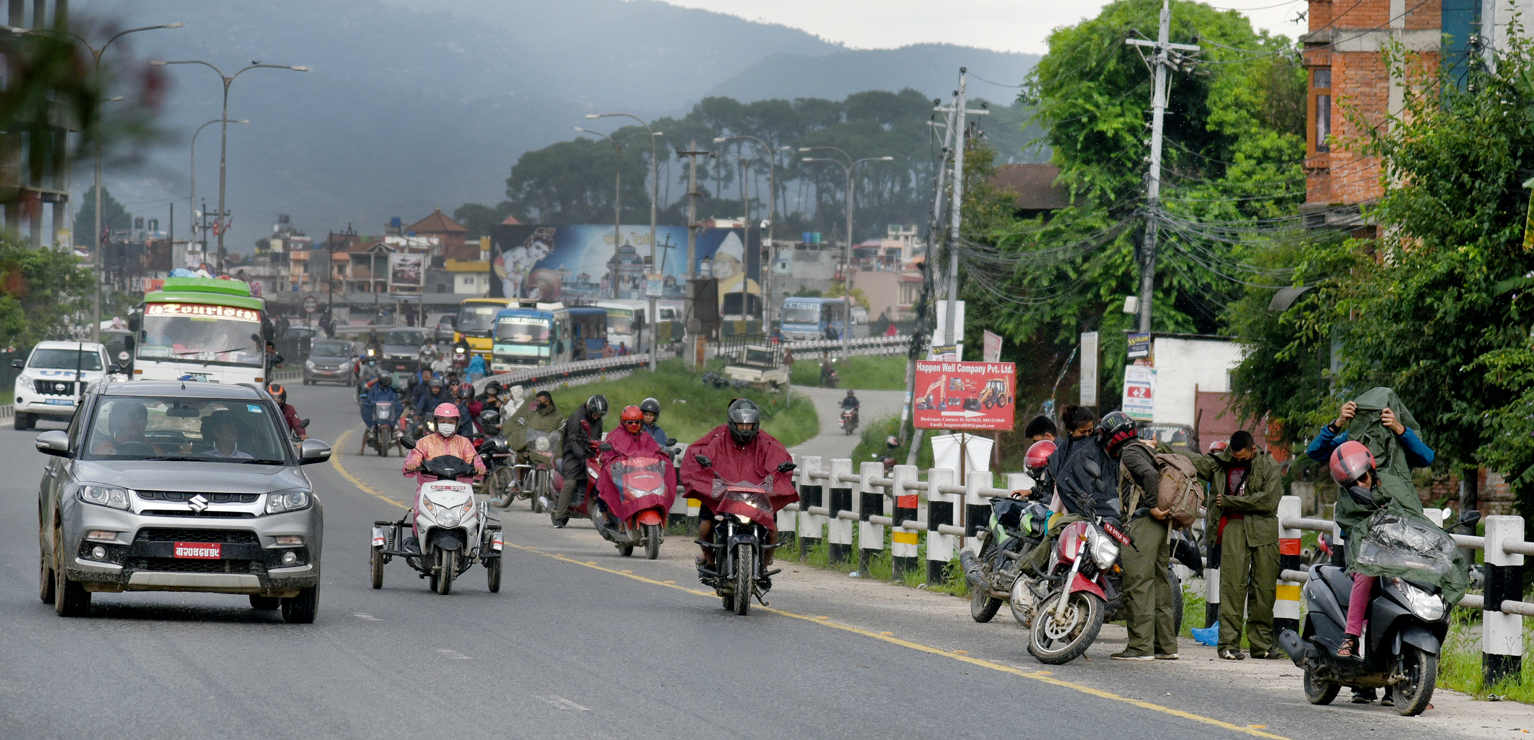 Motorcyclists put on raincoat in anticipation of rain, in Sallaghari, Bhaktapur, on Wednesday. Angad Dhakal/TKP