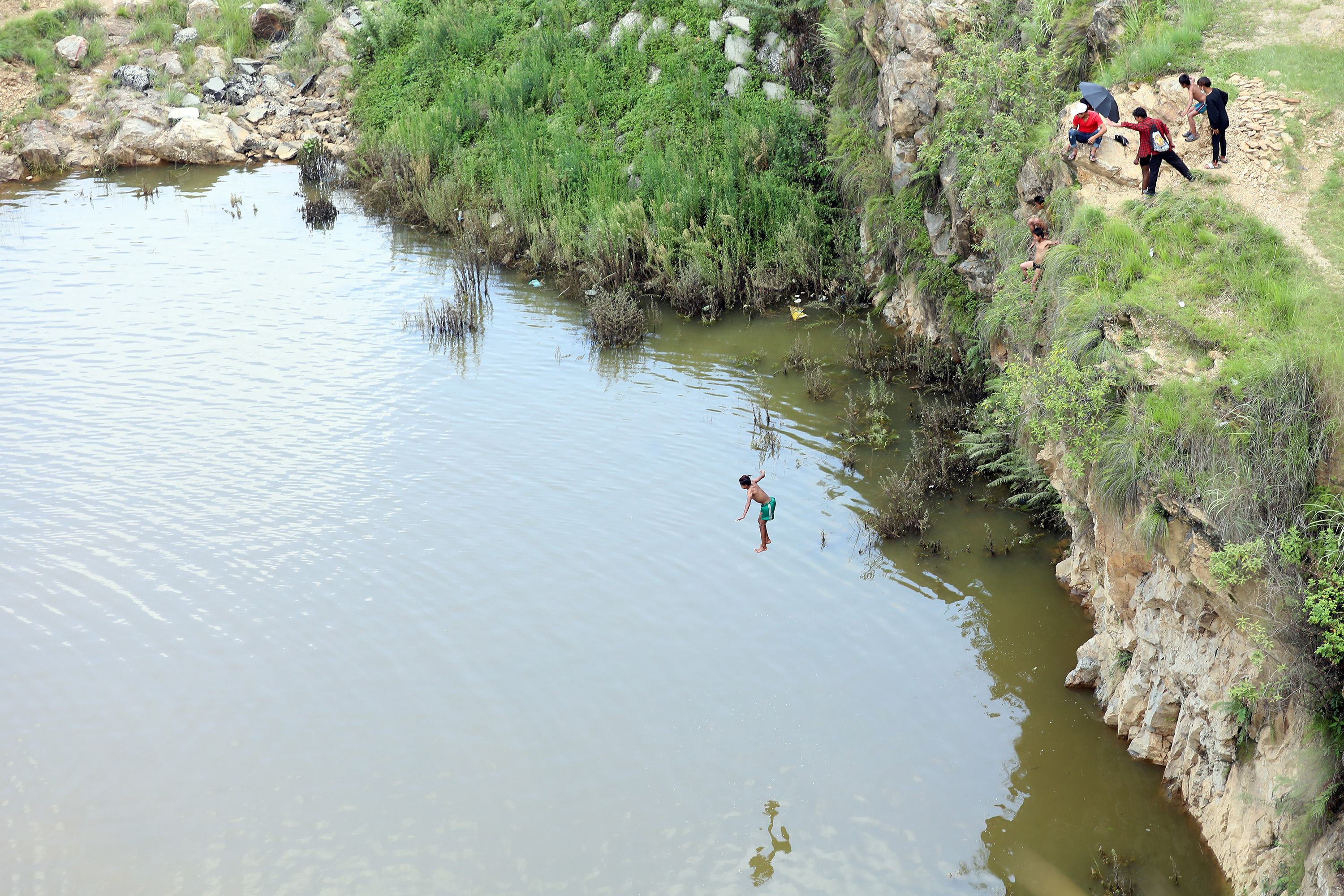 A boy jumps into a lake formed by rainwater as his friends and onlookers cheer him in Chobar, Kathmandu, on Sunday. Elite Joshi/TKP