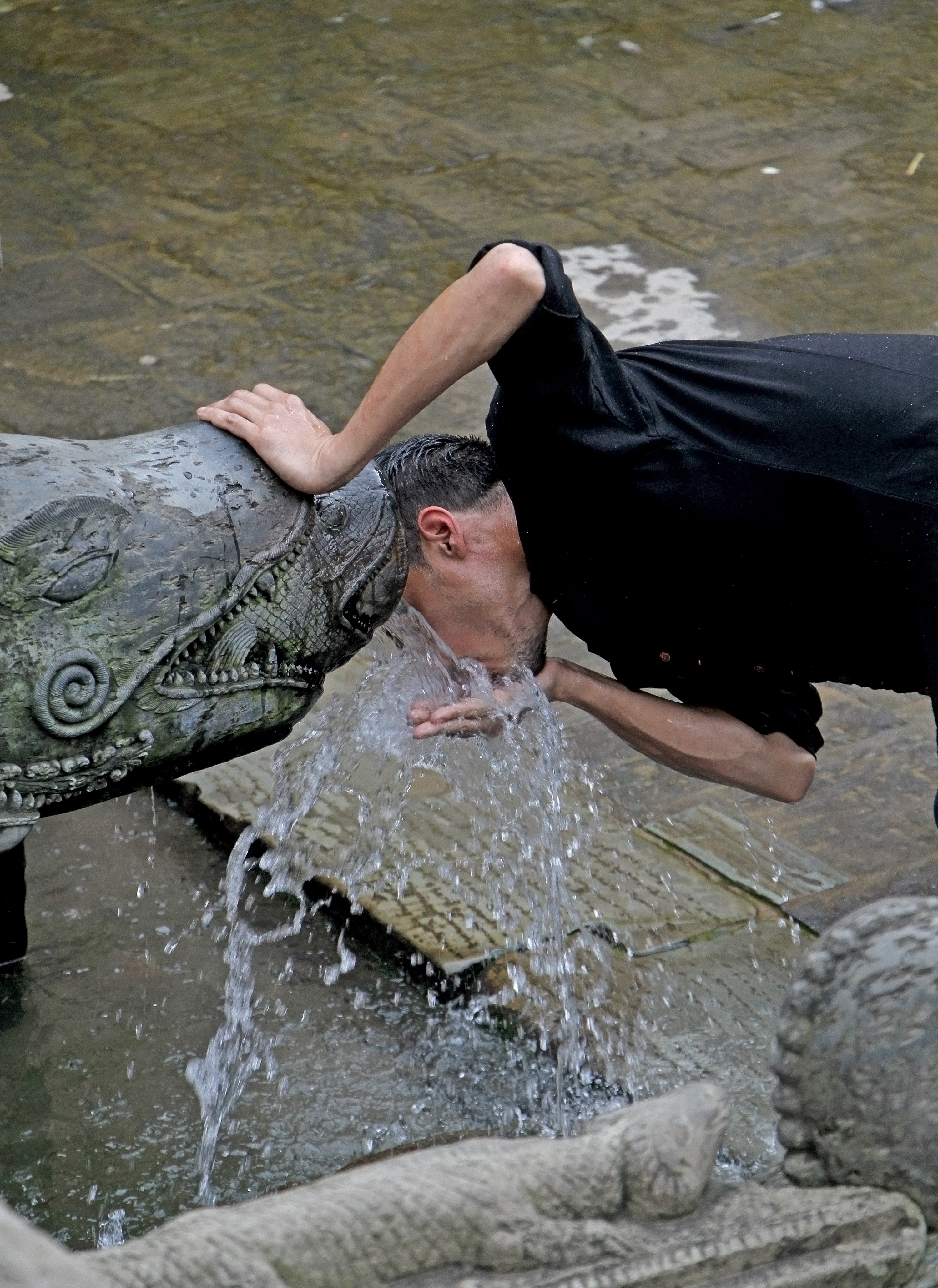 A man drinks water from a stone spout at Patan Durbar Square in Lalitpur. Monsoon rains have replenished the groundwater, reviving some stone spouts in Kathmandu Valley. Beeju Maharjan/TKP