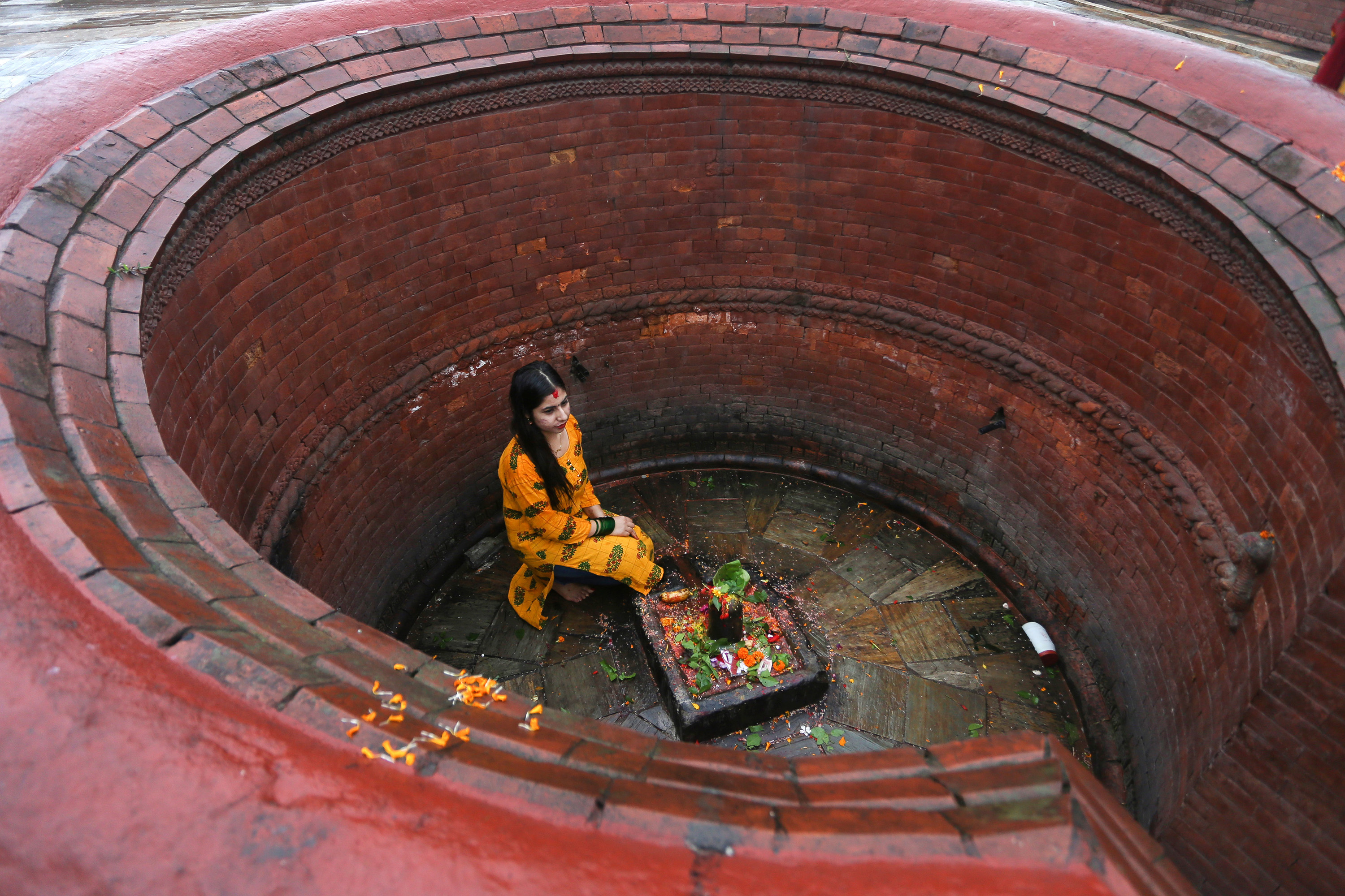 A devotee offers her prayers to Lord Shiva on the Pashupatinath temple premises in Kathmandu to mark the first Monday of the Nepali month of Shrawan. Elite Joshi/TKP