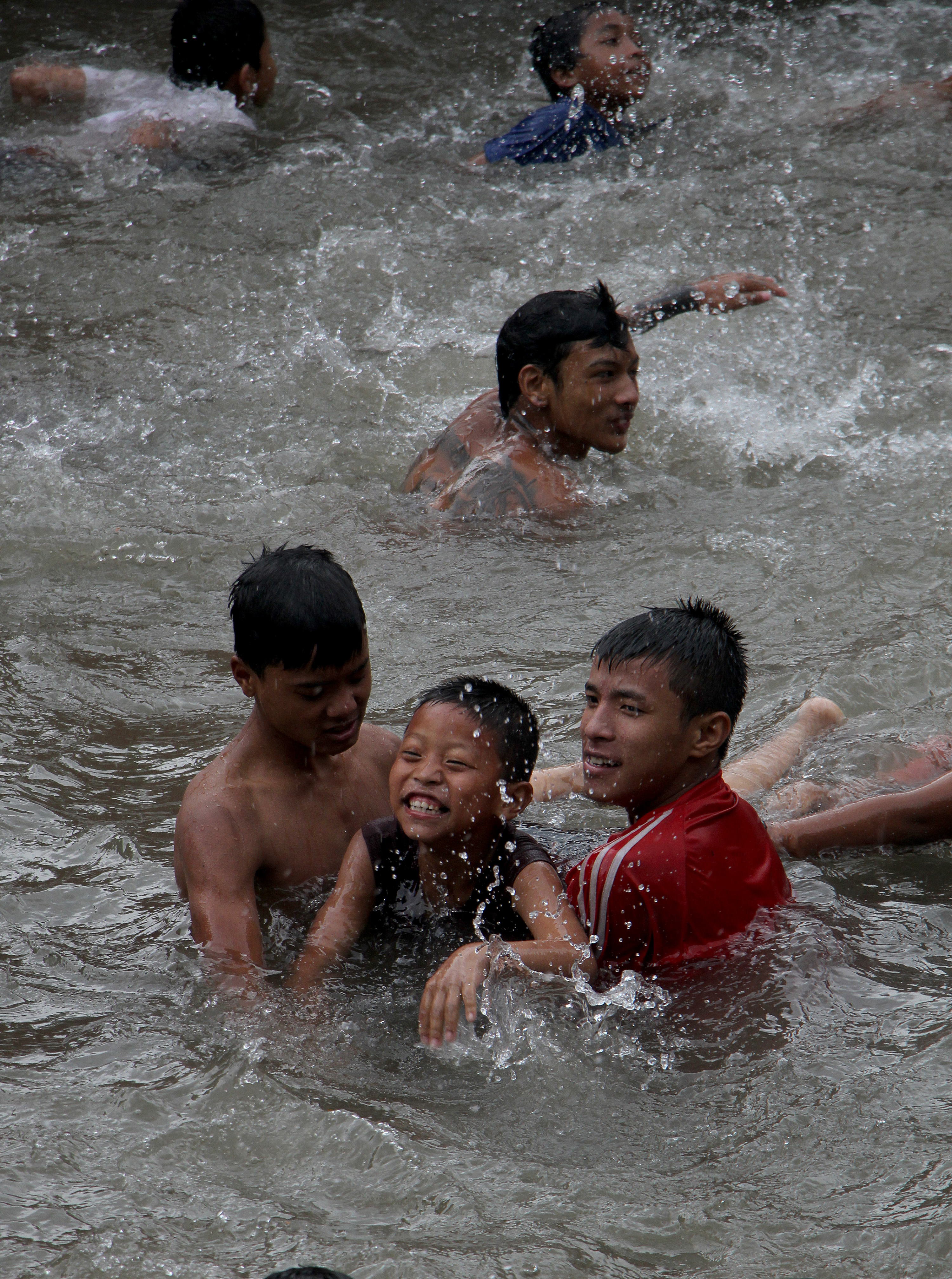 Children swim in a pond as it rains, in Bangalamukhi, Patan, on Saturday. Beeju Maharjan/TKP