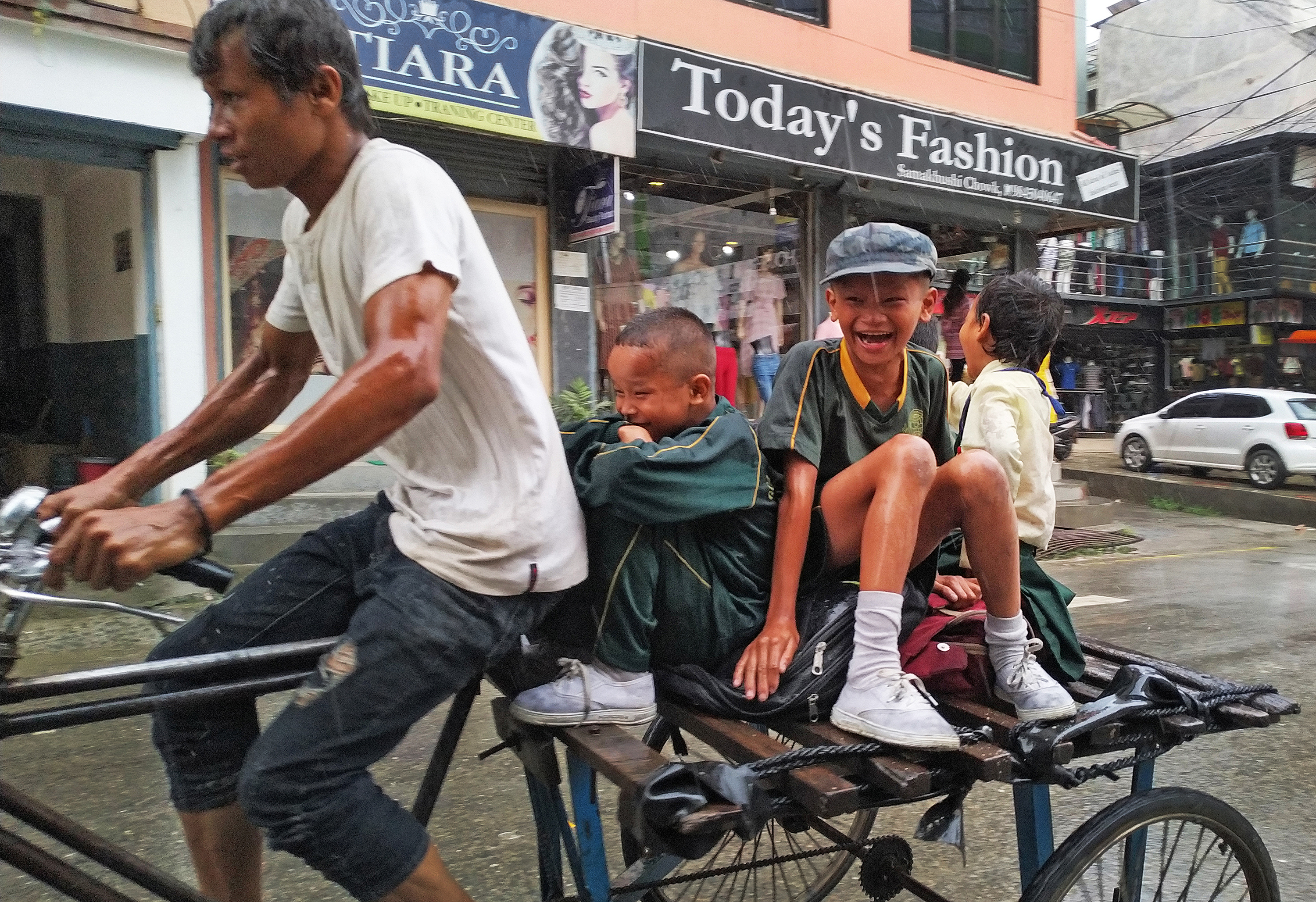 Children rejoice as they head towards school on a rickshaw on a rainy Monday morning in Kathmandu’s Samakhusi. Kabin Adhikari/TKP