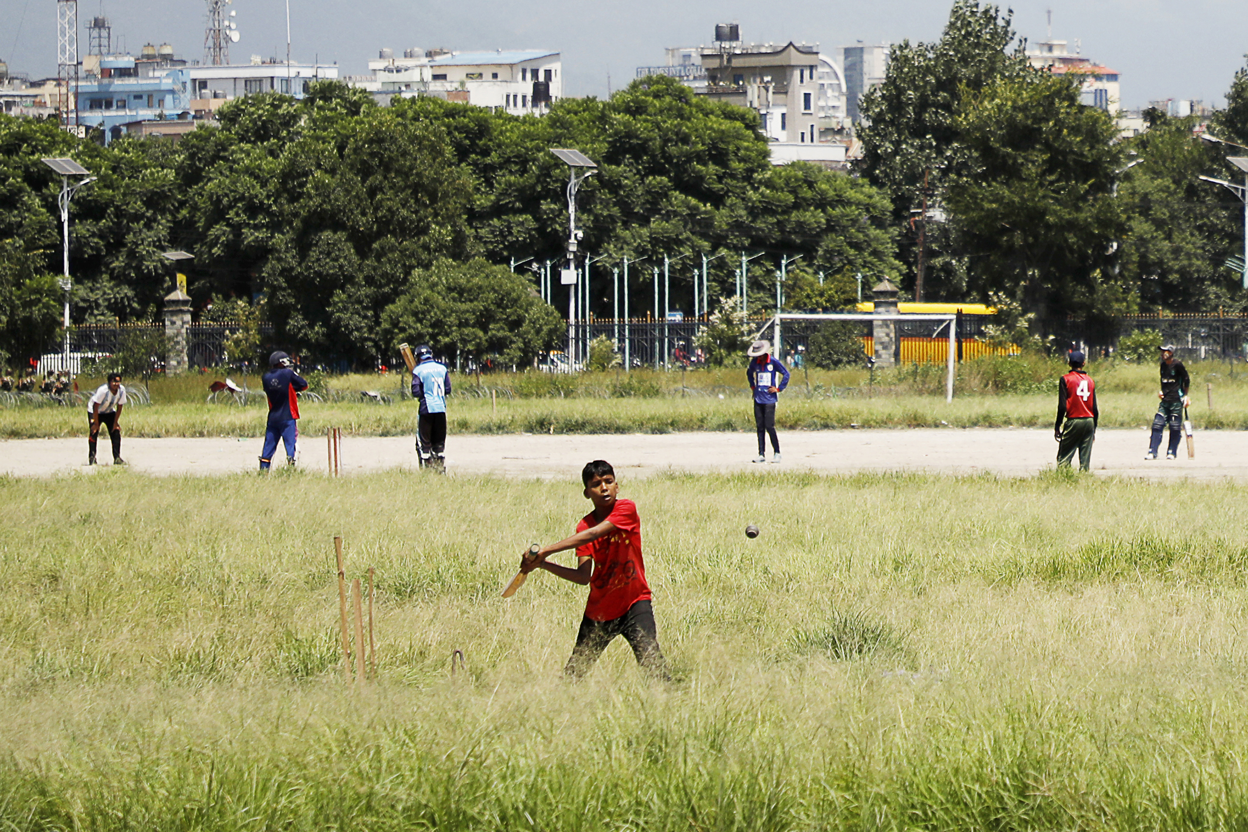 A boy tries to hit the ball while playing cricket at the Tundikhel grounds in Kathmandu on Tuesday. Sanjog Manandhar/TKP