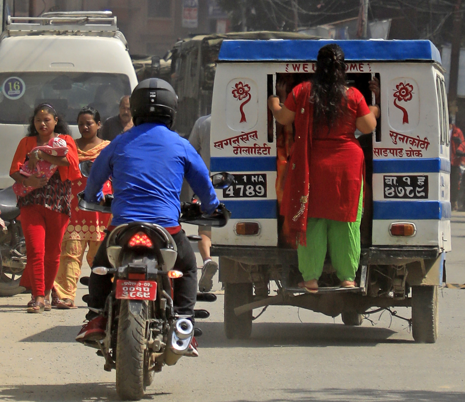 A woman stands on the step of a filled tempo in Lagankhel, Lalitpur. There were fewer public vehicles on the road on Monday because of the Teej festival. Hemanta Shrestha /TKP