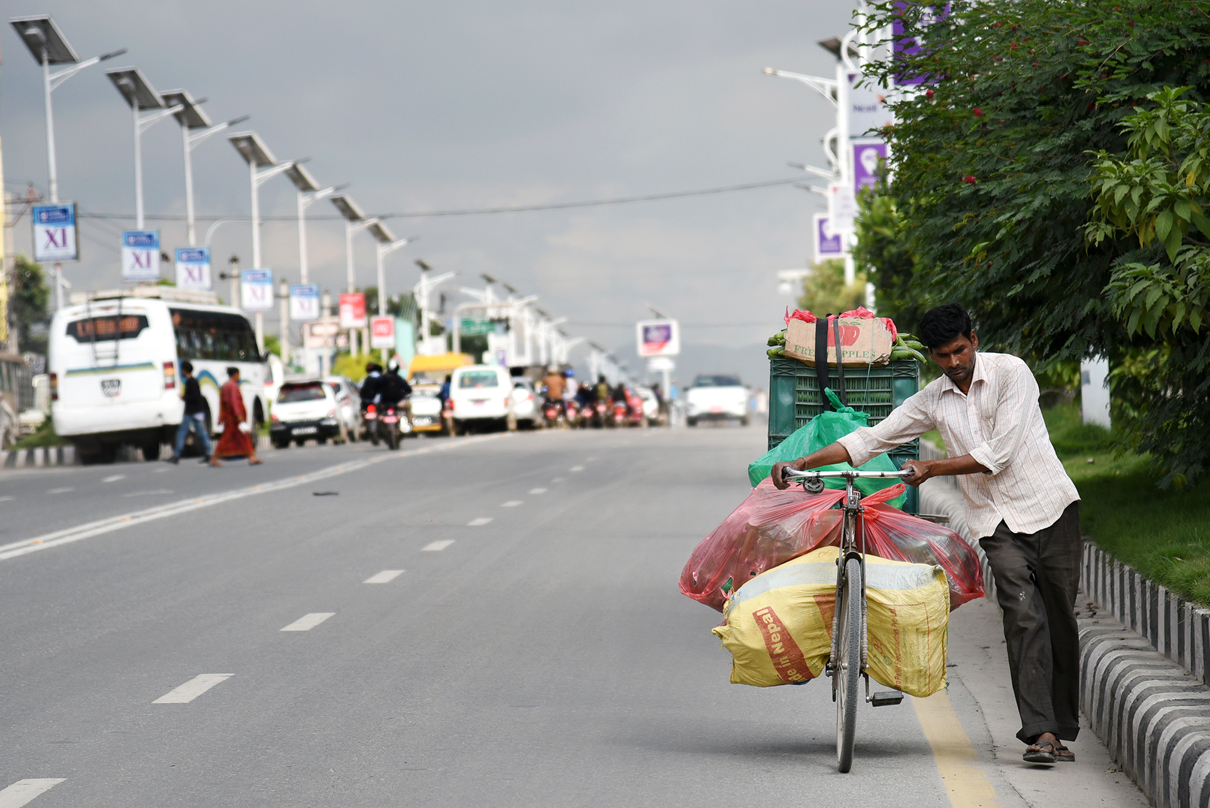 Binaya Gupta, a bicycle hawker from Motihari district of India, heading towards Anamnagar from Baneshwor to sell vegetables. Angad Dhakal /TKP