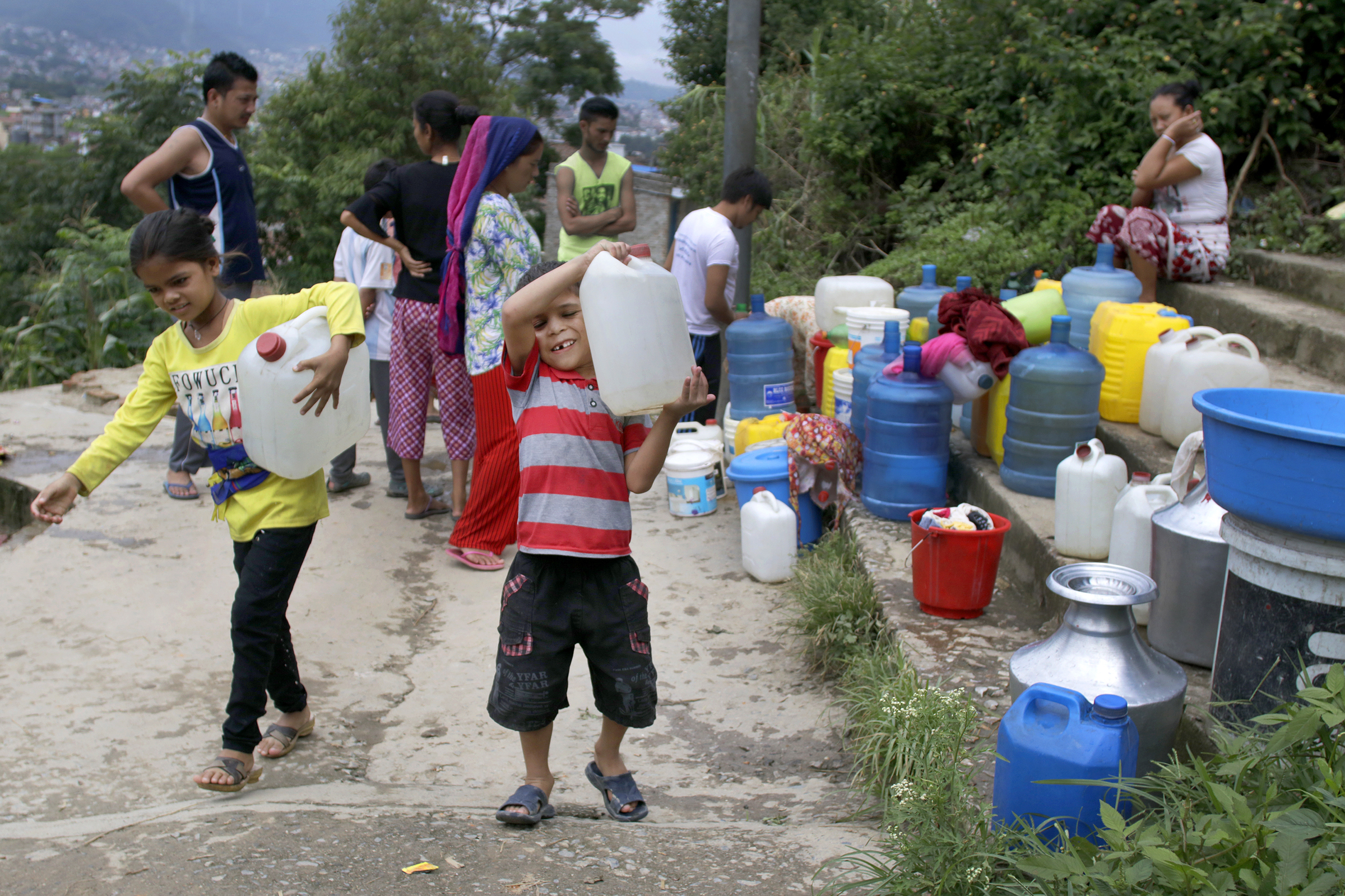 Six-year-old Himal Baduwal (right) and eight-year-old Phinsen Yadav, who study in LKG and Class 2 respectively at a school in Kritipur, deliver water to their homes after filling the vessels form a pipeline-lekage at Macha Dega in Kirtipur on Saturday. Anish Regmi /TKP