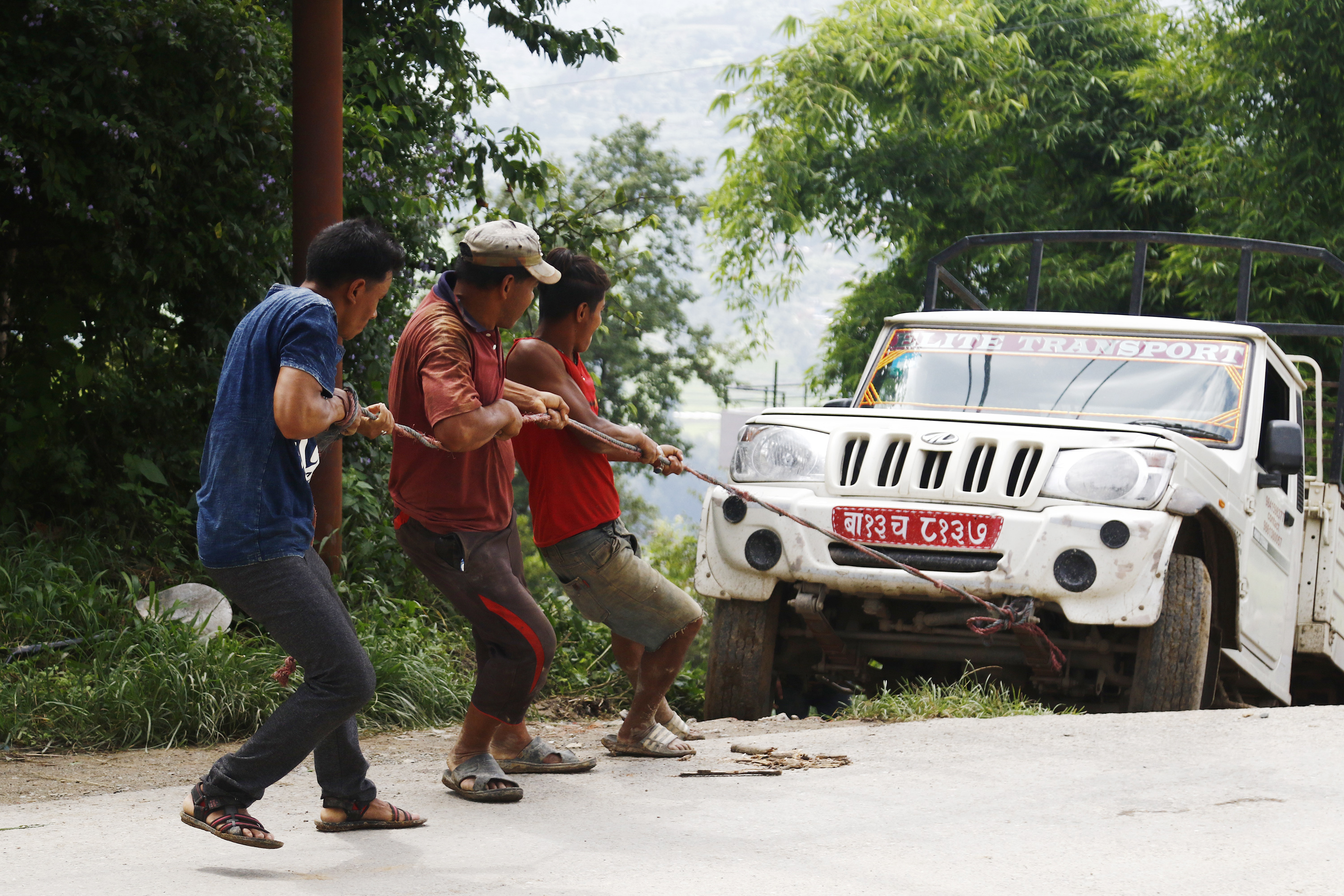People pull a vehicle stuck in a slope at Chhampi, Lalitpur, on Saturday. Keshav Thapa/TKP