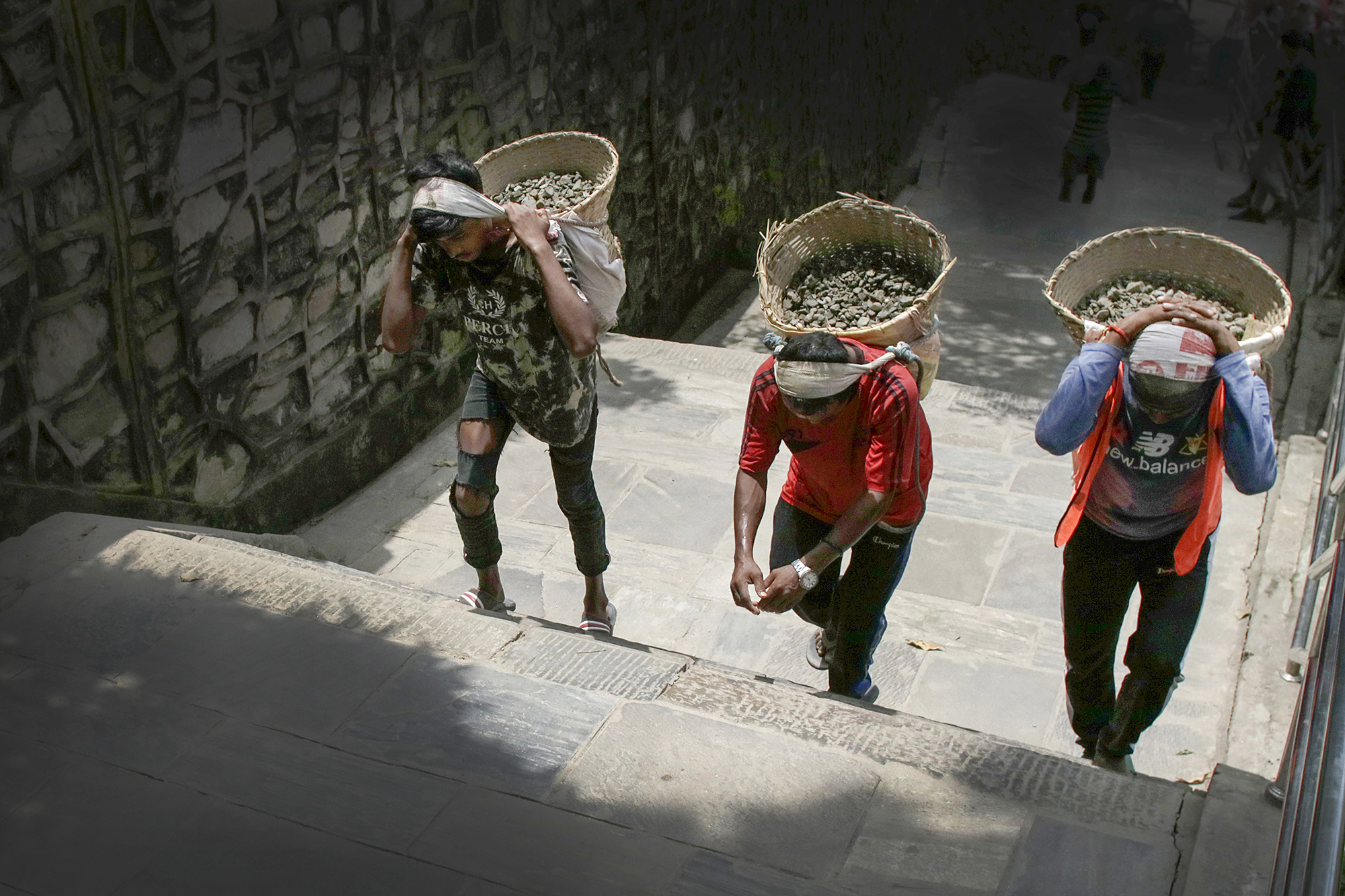 Workers deliver construction materials at the premises of Swayambhunath Stupa in Kathmandu. Anish Regmi /TKP