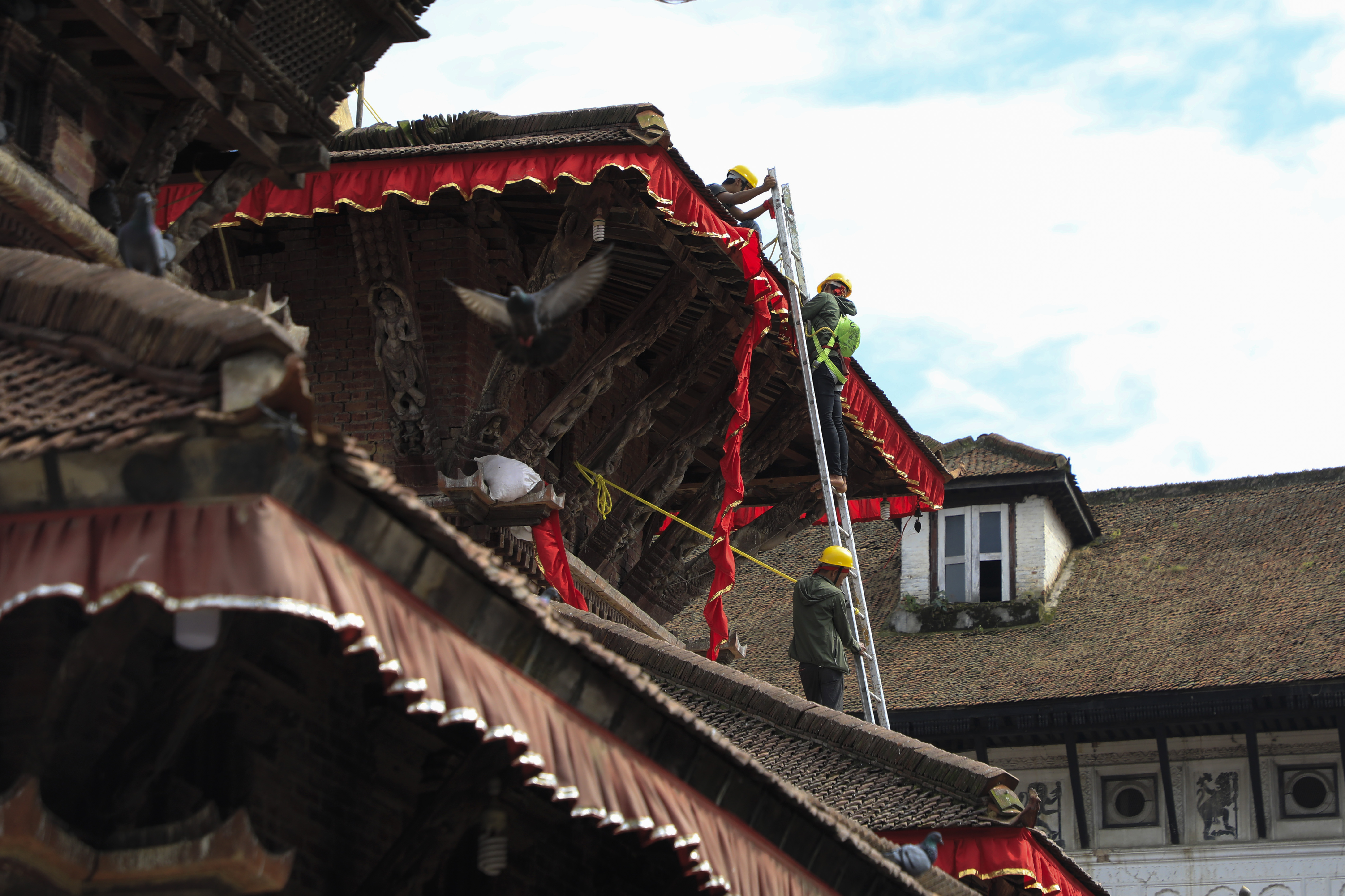 Workers decorate a temple roof for the upcoming Indrajatra at the Basantapur Durbar Square in Kathmandu on Sunday. Hemanta Shrestha/TKP