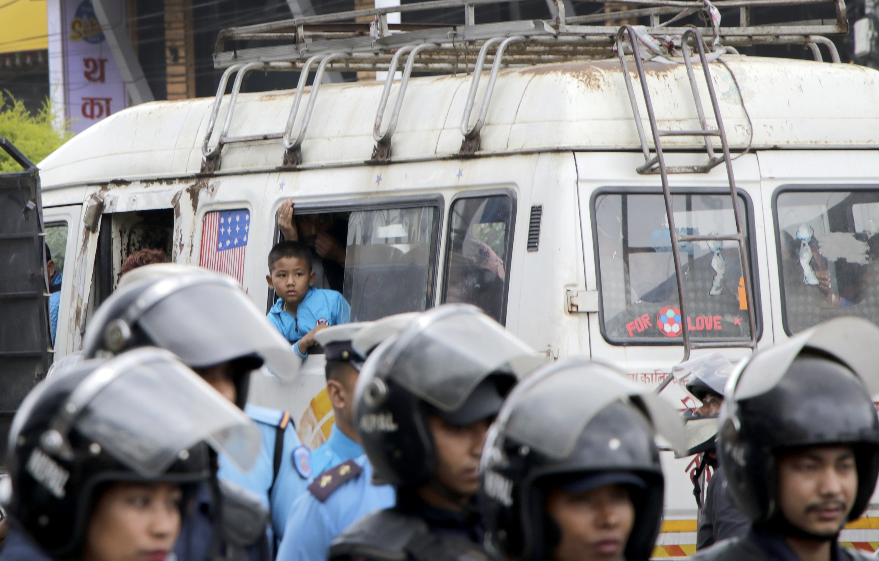 A boy looks at a rally, taken out by the Nepal Student Union to protest the culture of appointing officials in universities and other government departments on the basis of political sharing, from a bus window in Kathmandu on Sunday. Anish Regmi/TKP