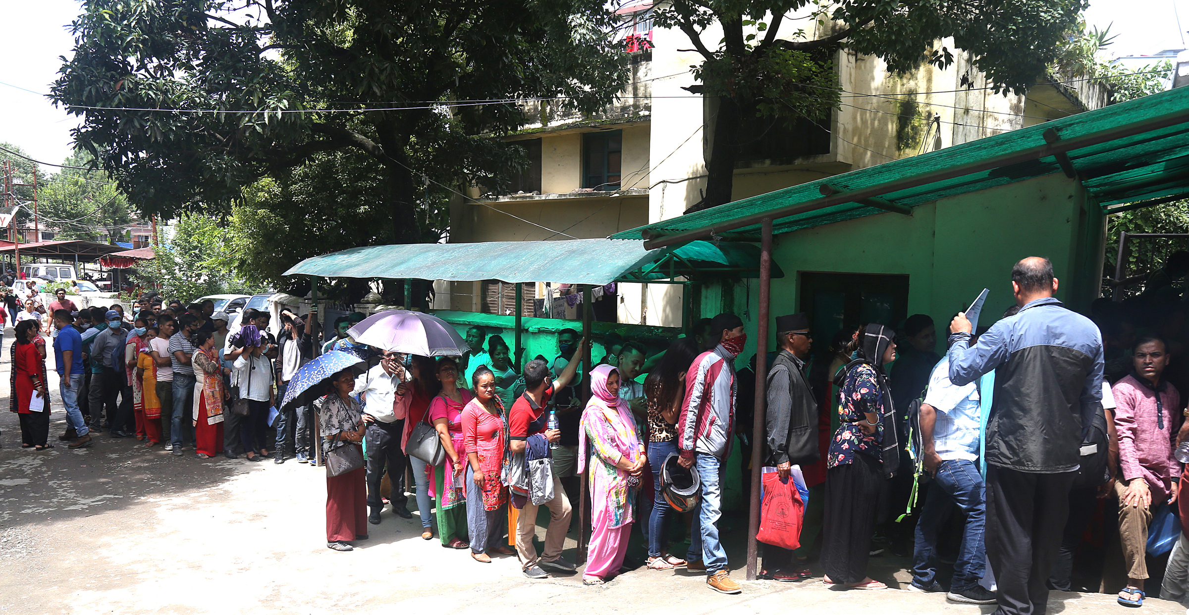 People stand in a queue at the ticket counter in Sukraraj Hospital, Teku, to get themselves checked for dengue on Friday. With dengue cases on the rise, there is an air of alarm in the Valley. Kabin Adhikari/ TKP