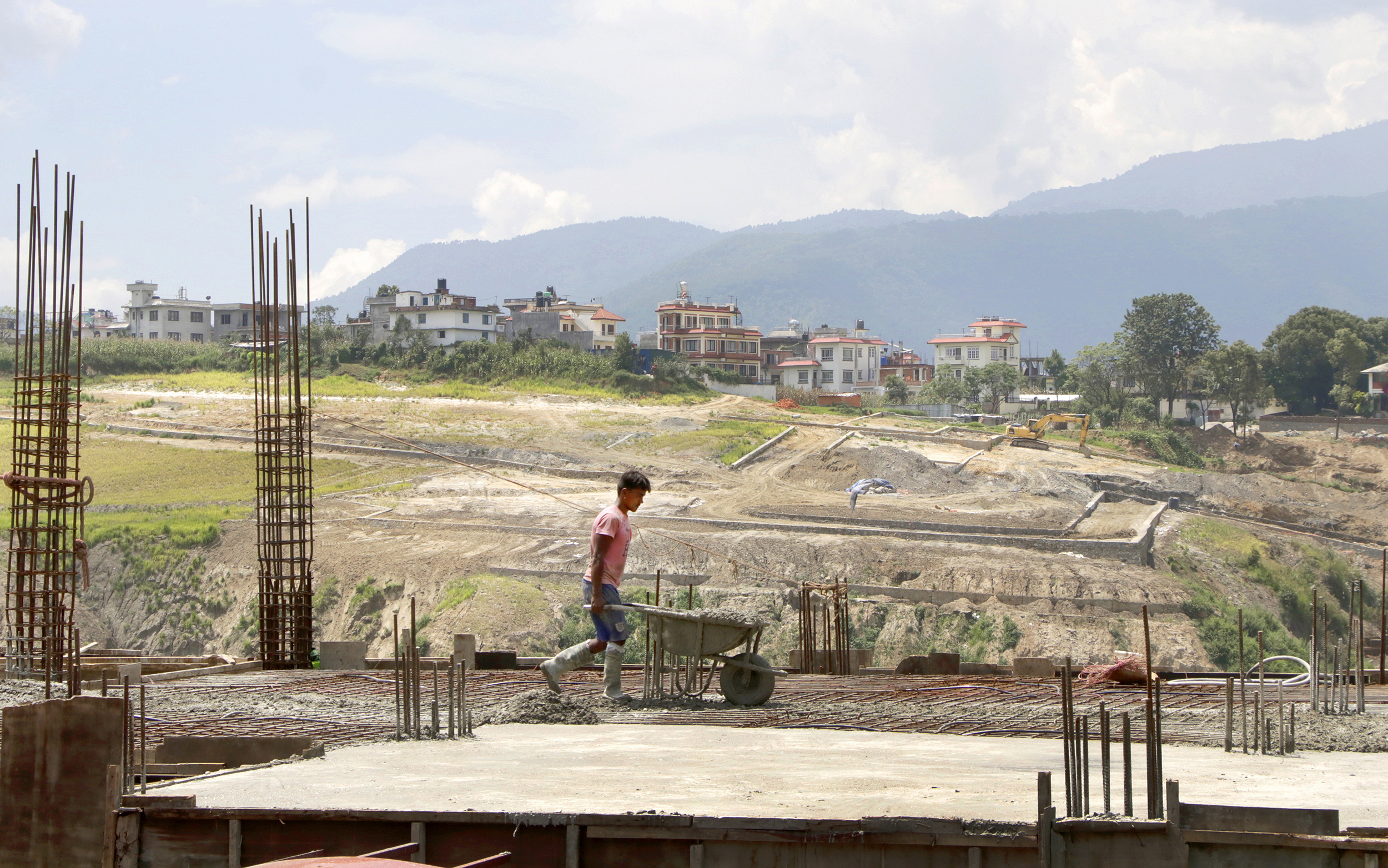 A worker at a construction site in Dhapakhel, Lalitpur, on Monday. Open spaces in the Valley are being lost to rampant urbanisation. Anish Regmi/TKP