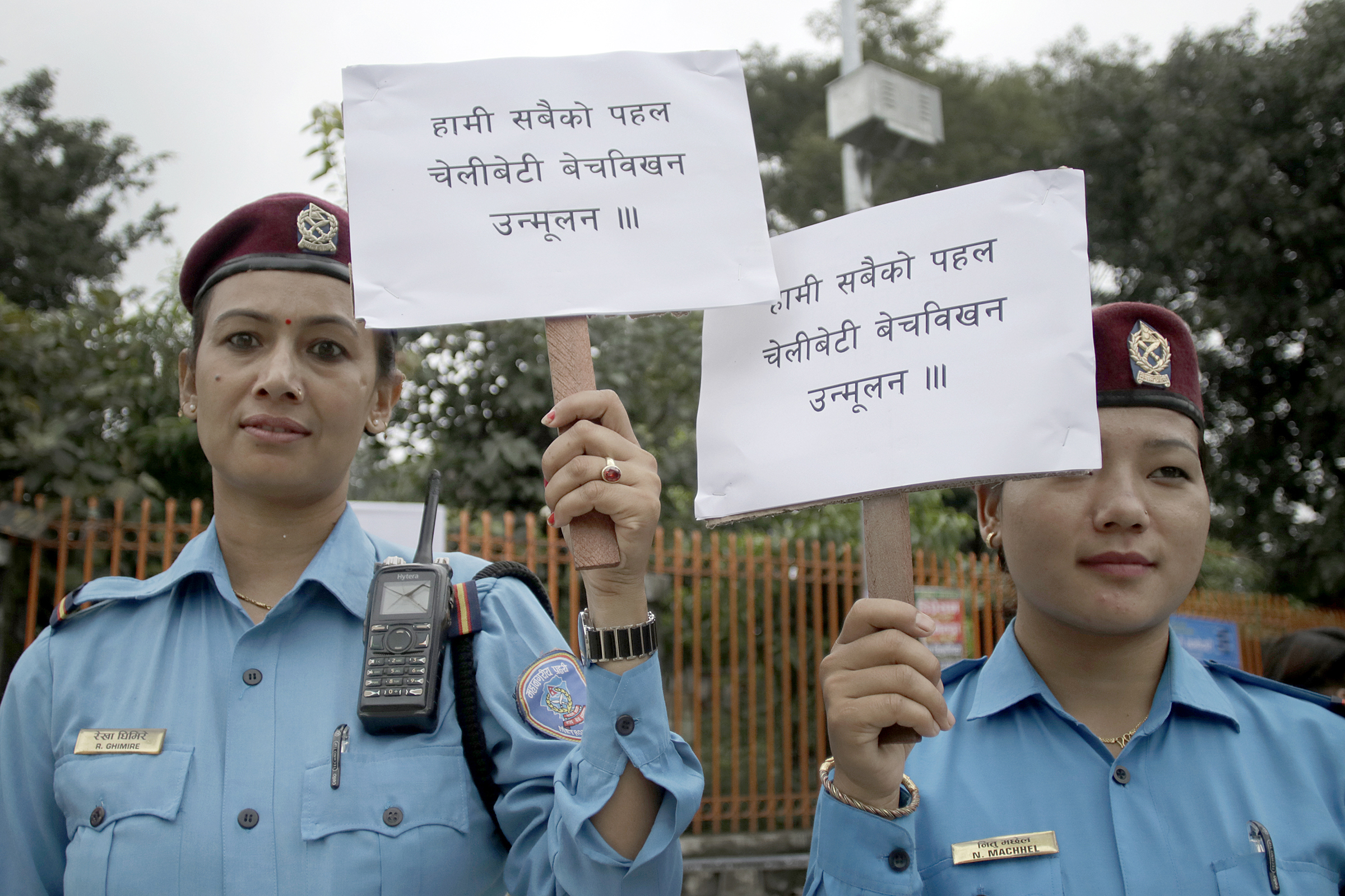 Security personnel participate in a silent demonstration organised by Maiti Nepal to mark the 13th National Day against Human Trafficking and Transportation at Gaushala, Kathmandu on Thursday. Anish Regmi /TKP