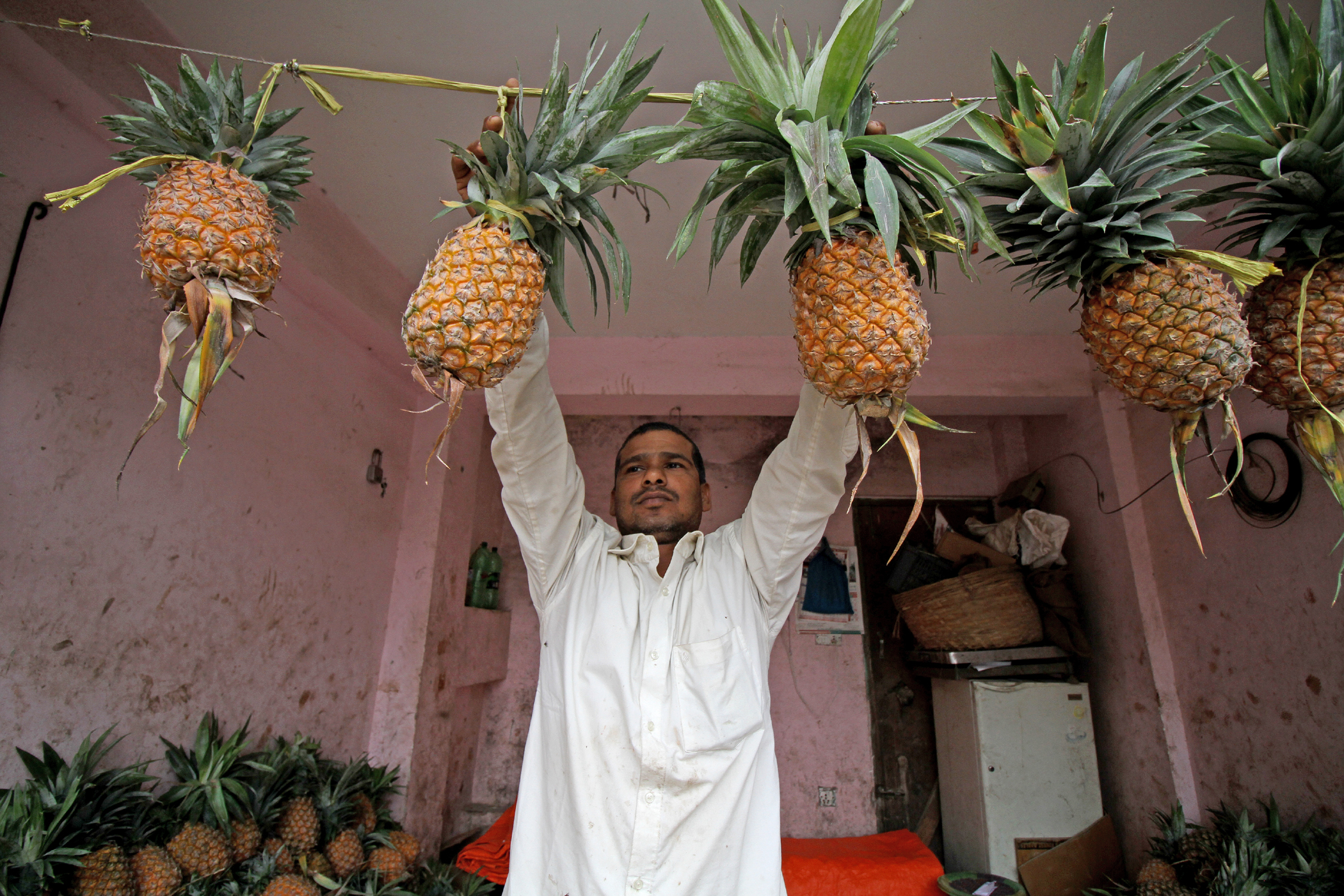 A shopkeeper hangs pineapples at a shop in Kuleshwor, Kathmandu on Tuesday. The fruit is imported from Siliguri, India. Beeju Maharjan/TKP