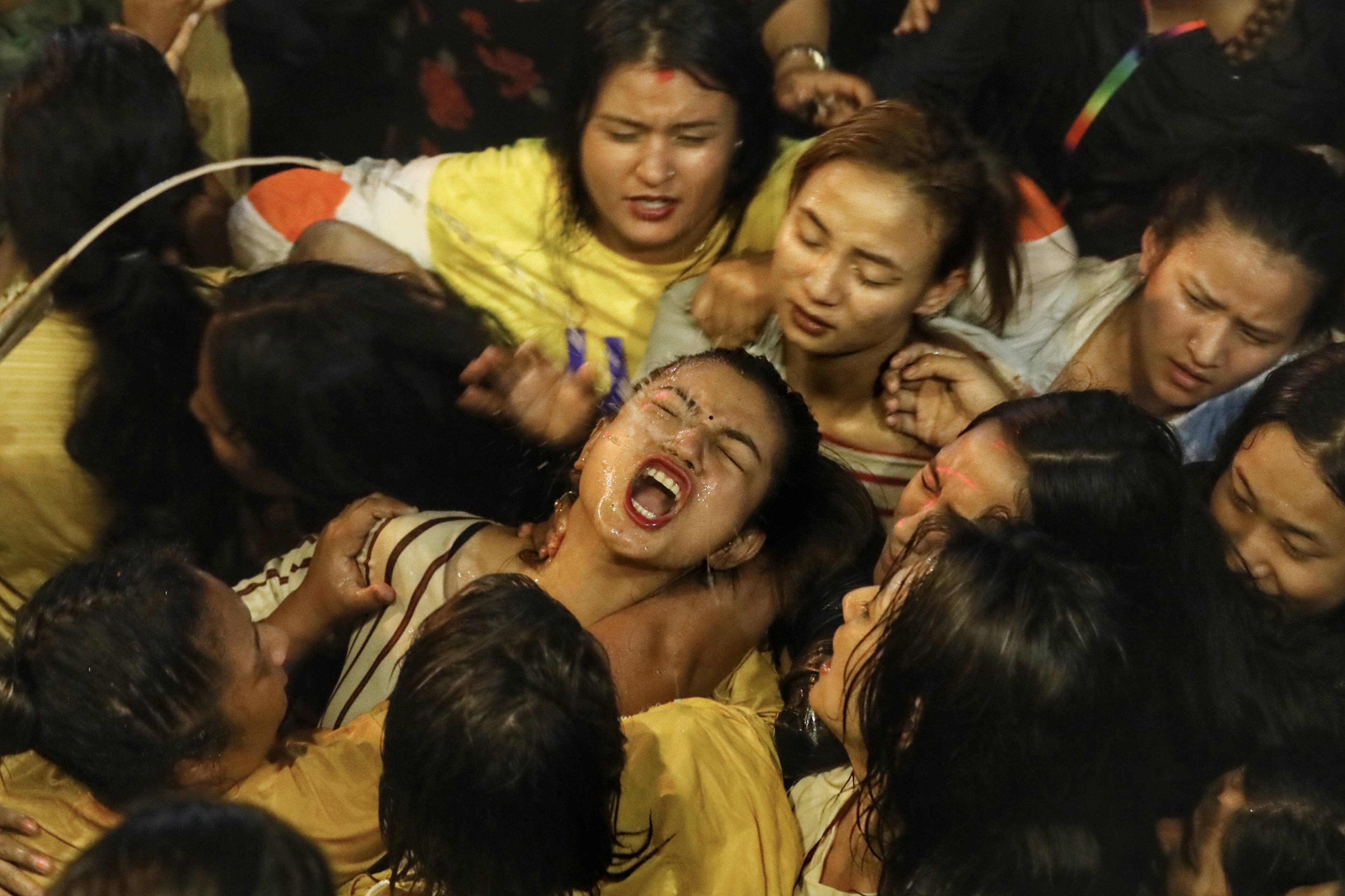 Female devotees drink homemade alcohol as blessings that keep them free from all diseases during celebrations of the Indra Jatra festival at Hanumandhoka Durbar Square in Kathmandu on Sunday. Sanjog Manandhar /TKP