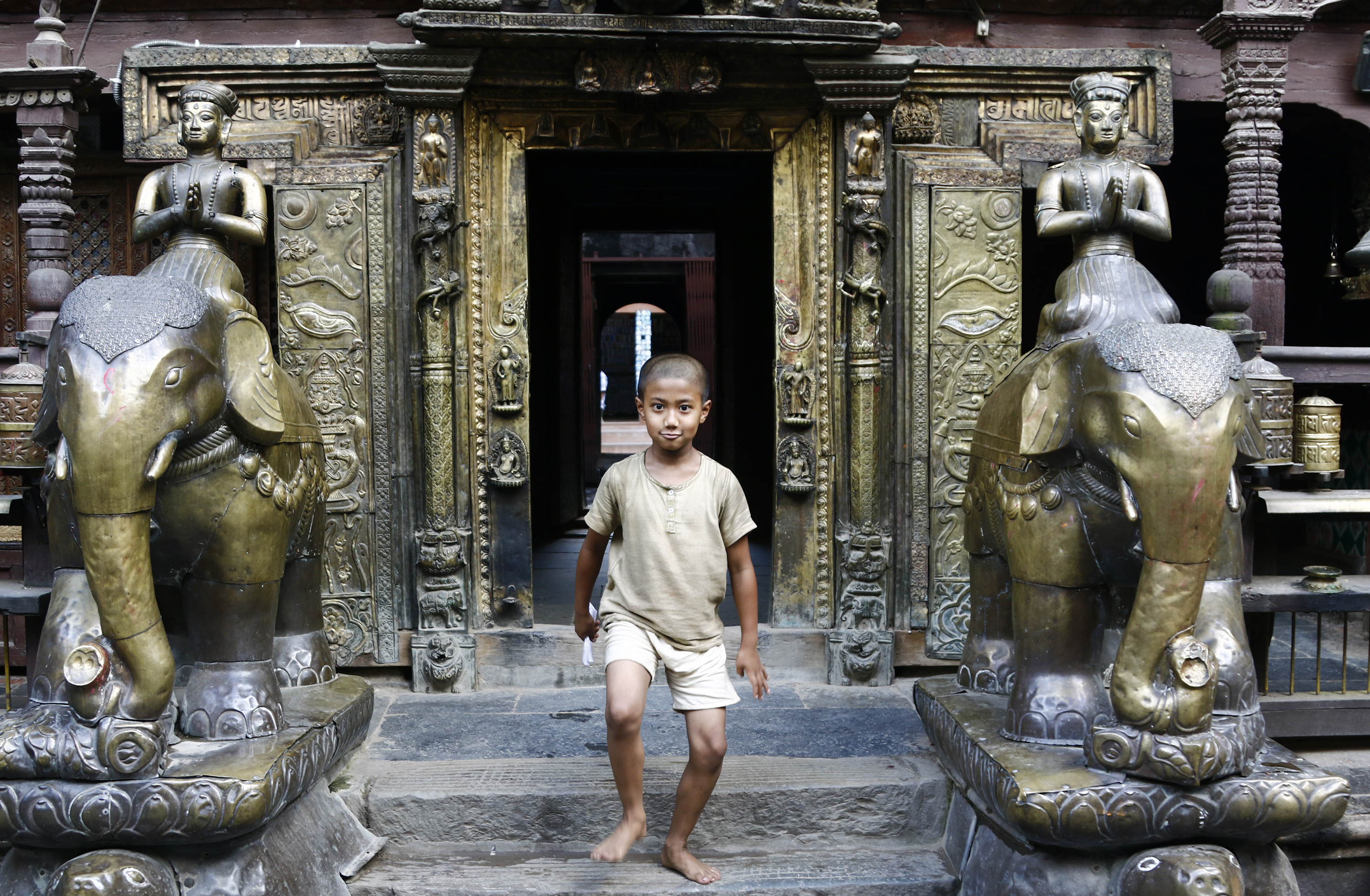 A nine-year-old priest enters the Golden Temple in Patan for evening prayers. At the 12th-century temple, only boys under 12 become the main priest, and are changed every 30 days. Keshav Thapa/TKP