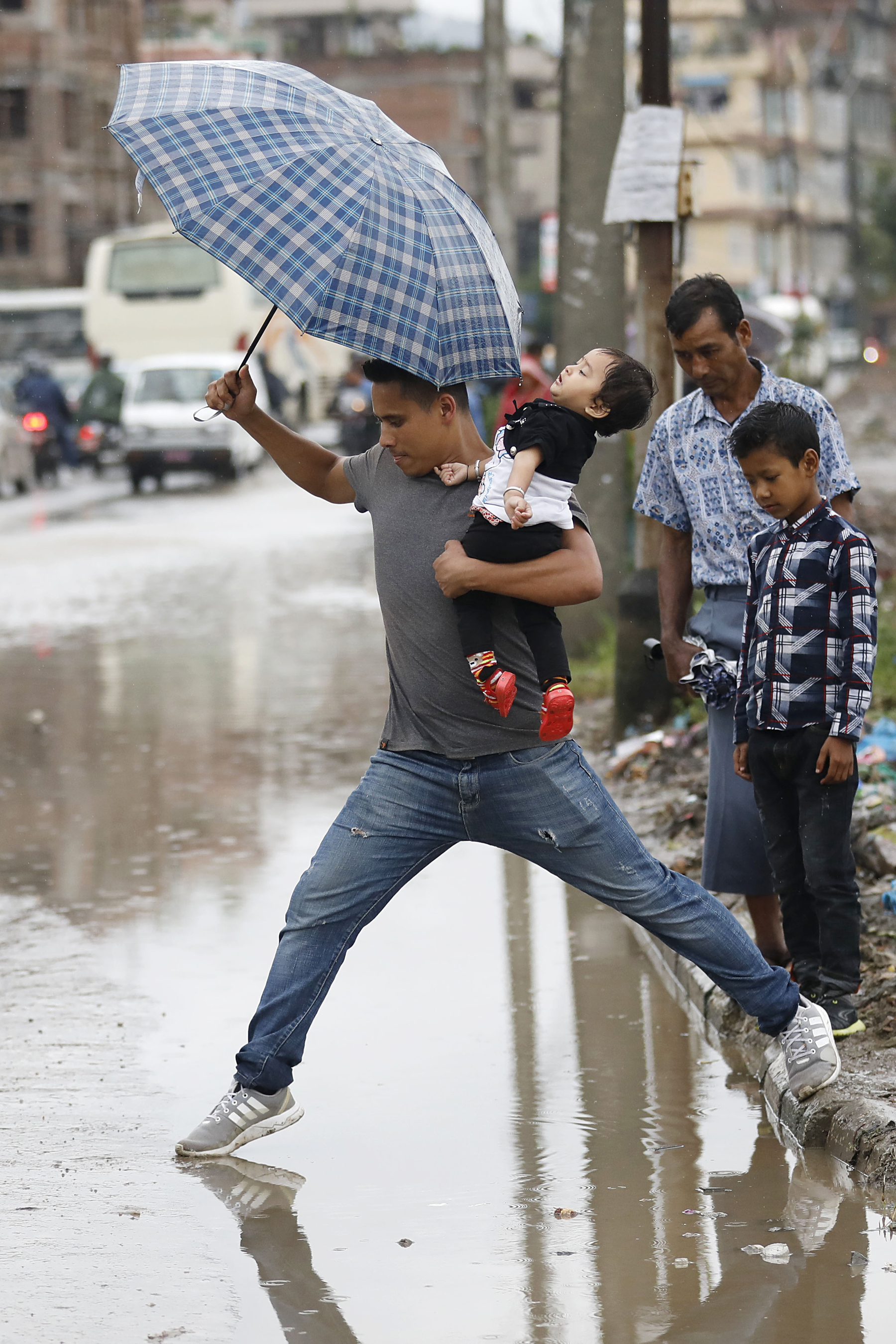 A man carrying a baby jumps over rainwater flowing on a road in Kathmandu on Tuesday. Sanjog Manandhar/TKP