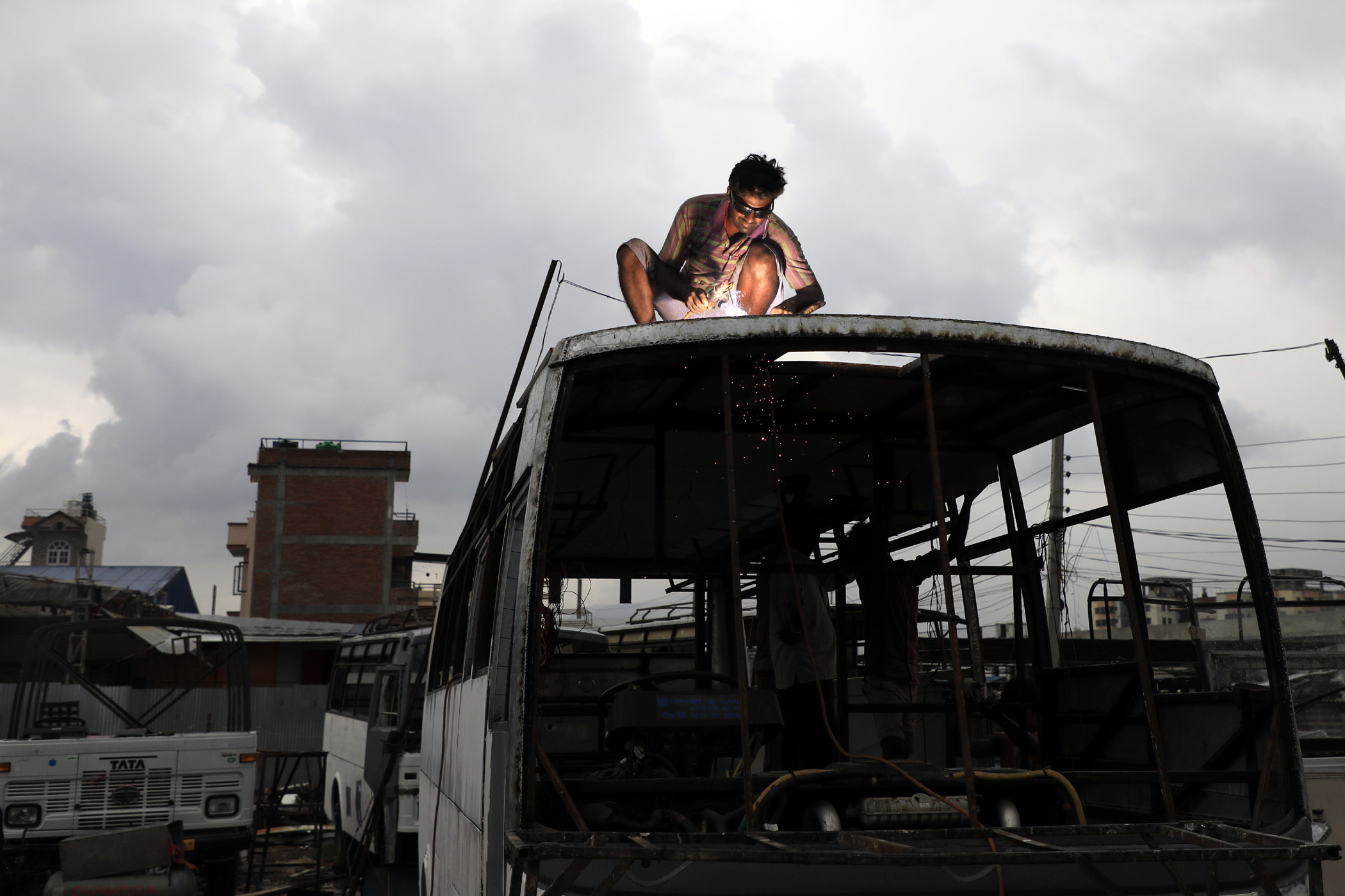 A welder works on the body of a bus at an automobile workshop in Chyasal, Lalitpur. Transport entrepreneurs are adding more buses to their fleet to deal with the passenger rush during Dashain. Hemanta Shrestha/TKP