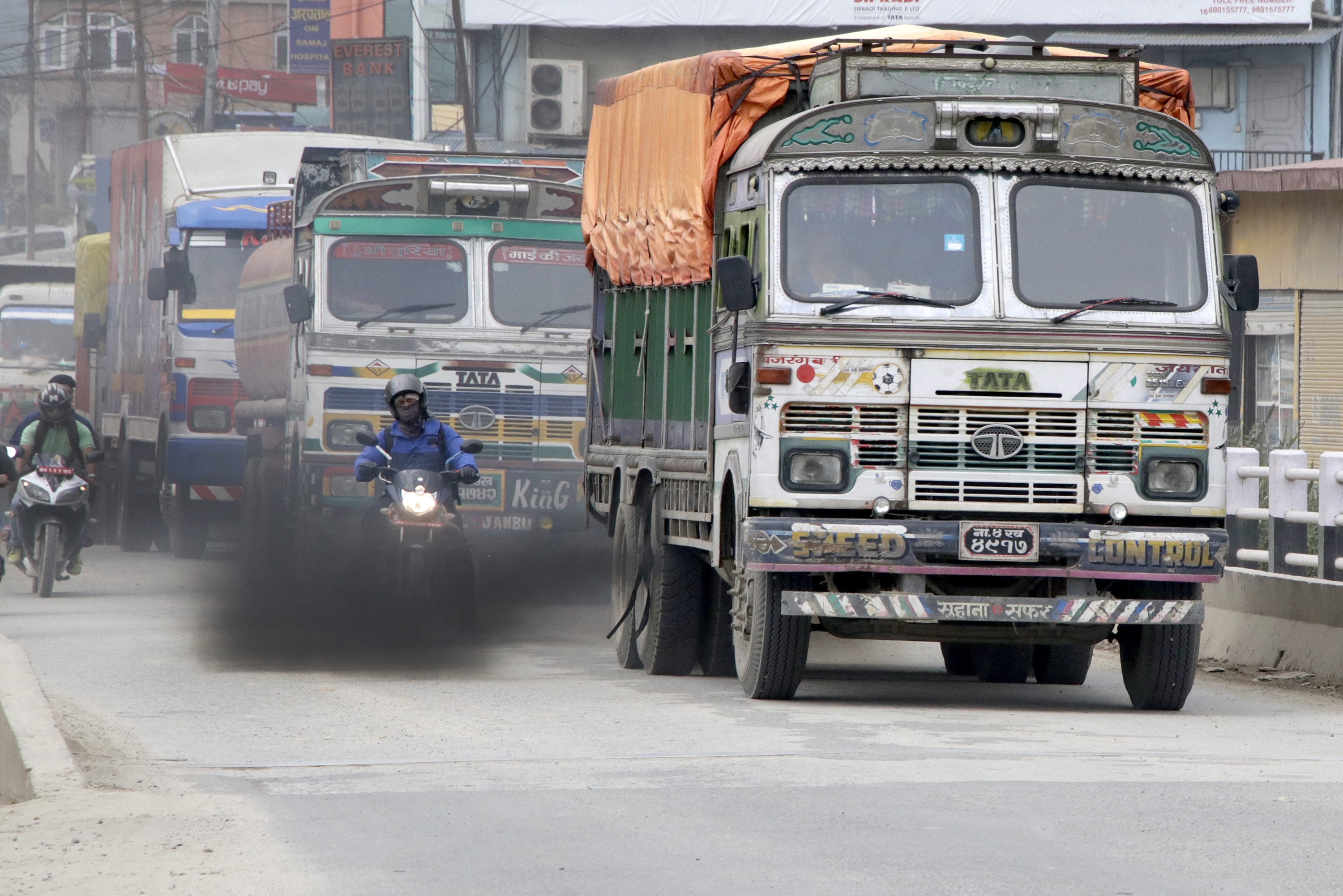A motorist is caught in the fume emitted by a truck at Naikap in Kathmandu. Air pollution gets severe in the Valley as fall advances. Anish Regmi/TKP