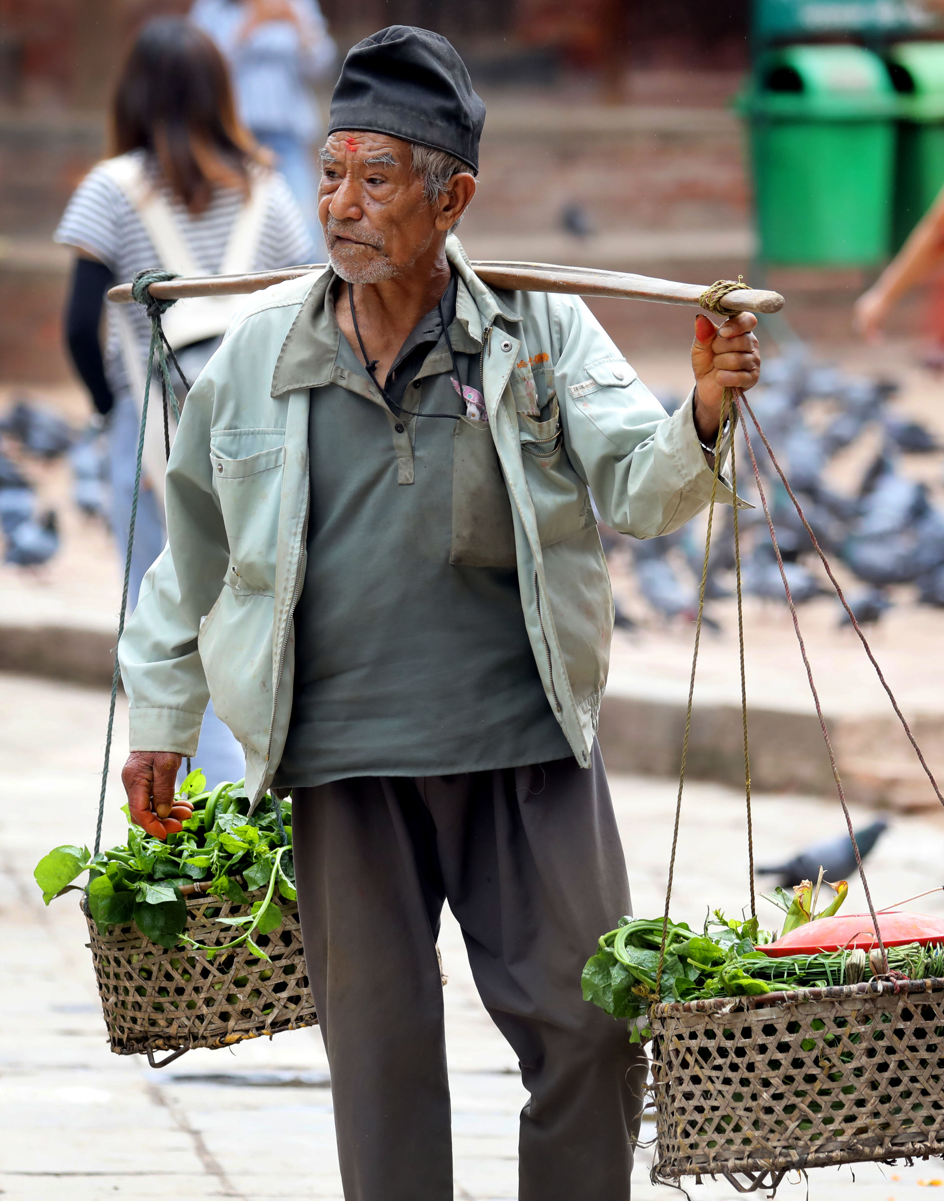 A vegetable sellers carries his produce in a set of traditional bamboo baskets called Kharpan in Kathmandu Durbar Square. Elite Joshi /TKP