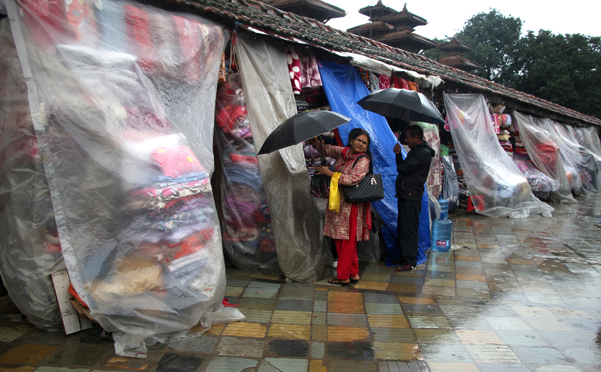 Plastic sheets cover the street shop fronts to protect the merchandise from rain in Basantapur, Kathmandu, on Wednesday. Beeju Maharjan/TKP
