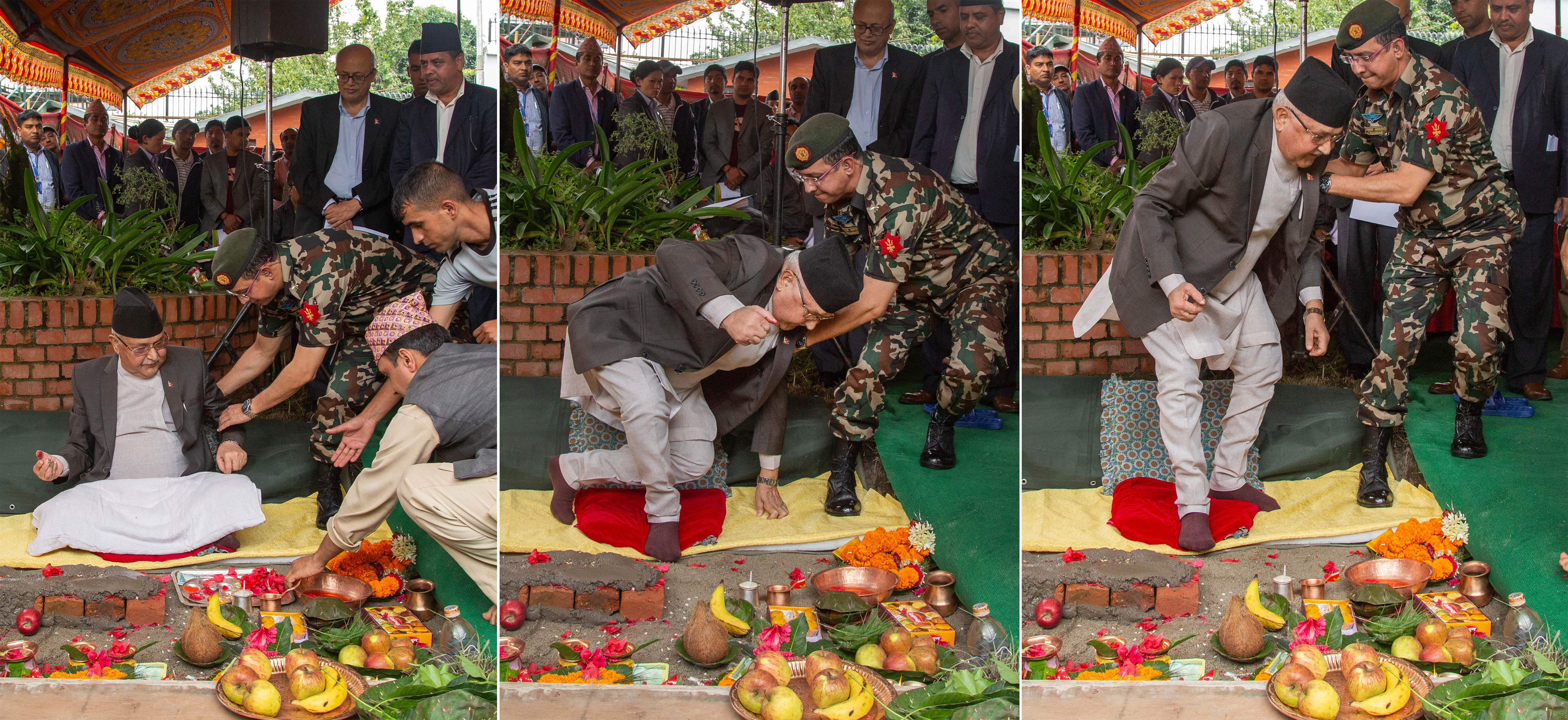 Prime Minister KP Sharma Oli is assisted on his feet by his security guard during the foundation laying ceremony for a new Prime Minister’s Residence in Baluwatar, Kathmandu, on Thursday. Prakash Chandra Timilsena/TKP