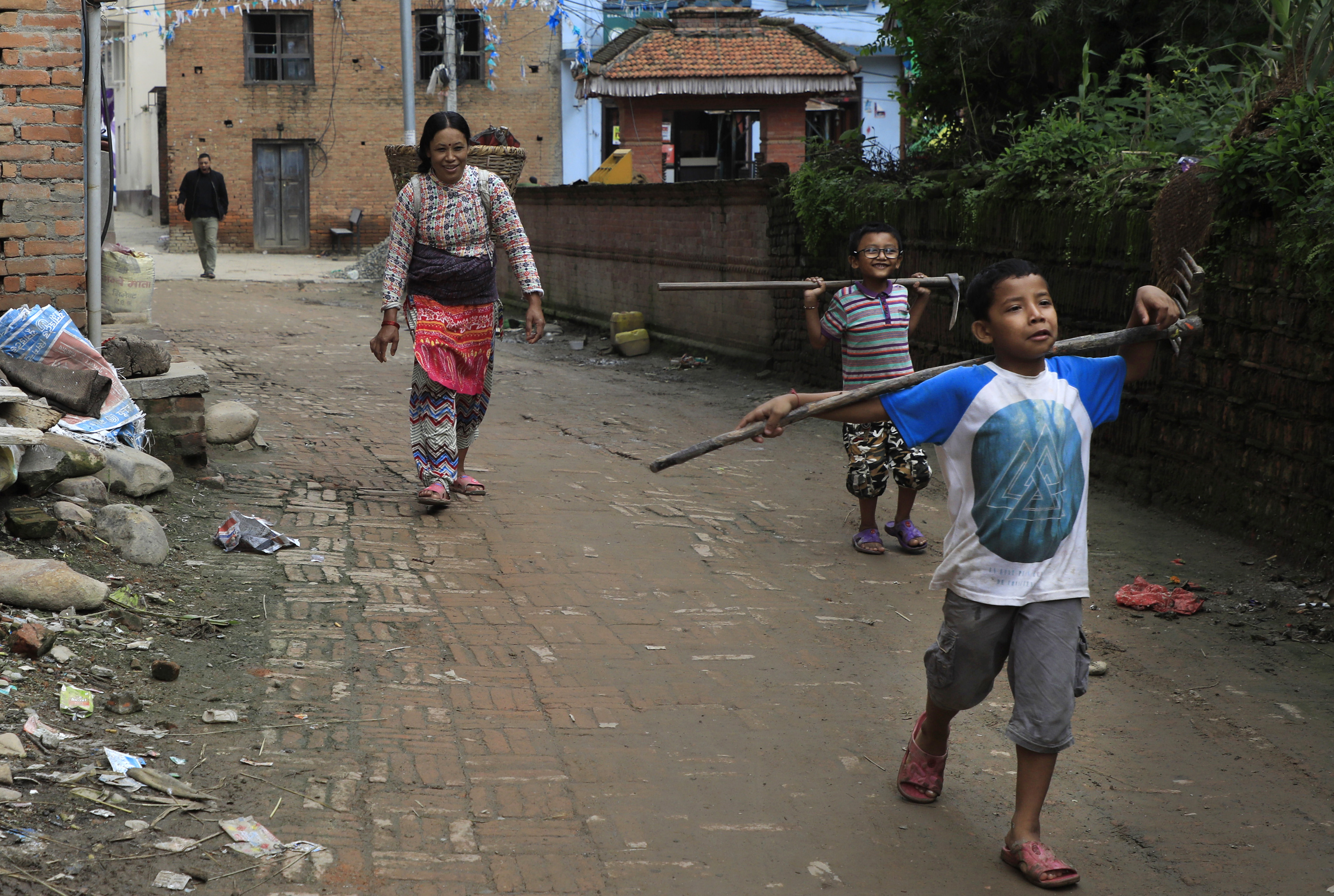 A woman and two young boys head towards a field with farming tools in Sunakothi, Lalitpur. Hemanta Shrestha /TKP