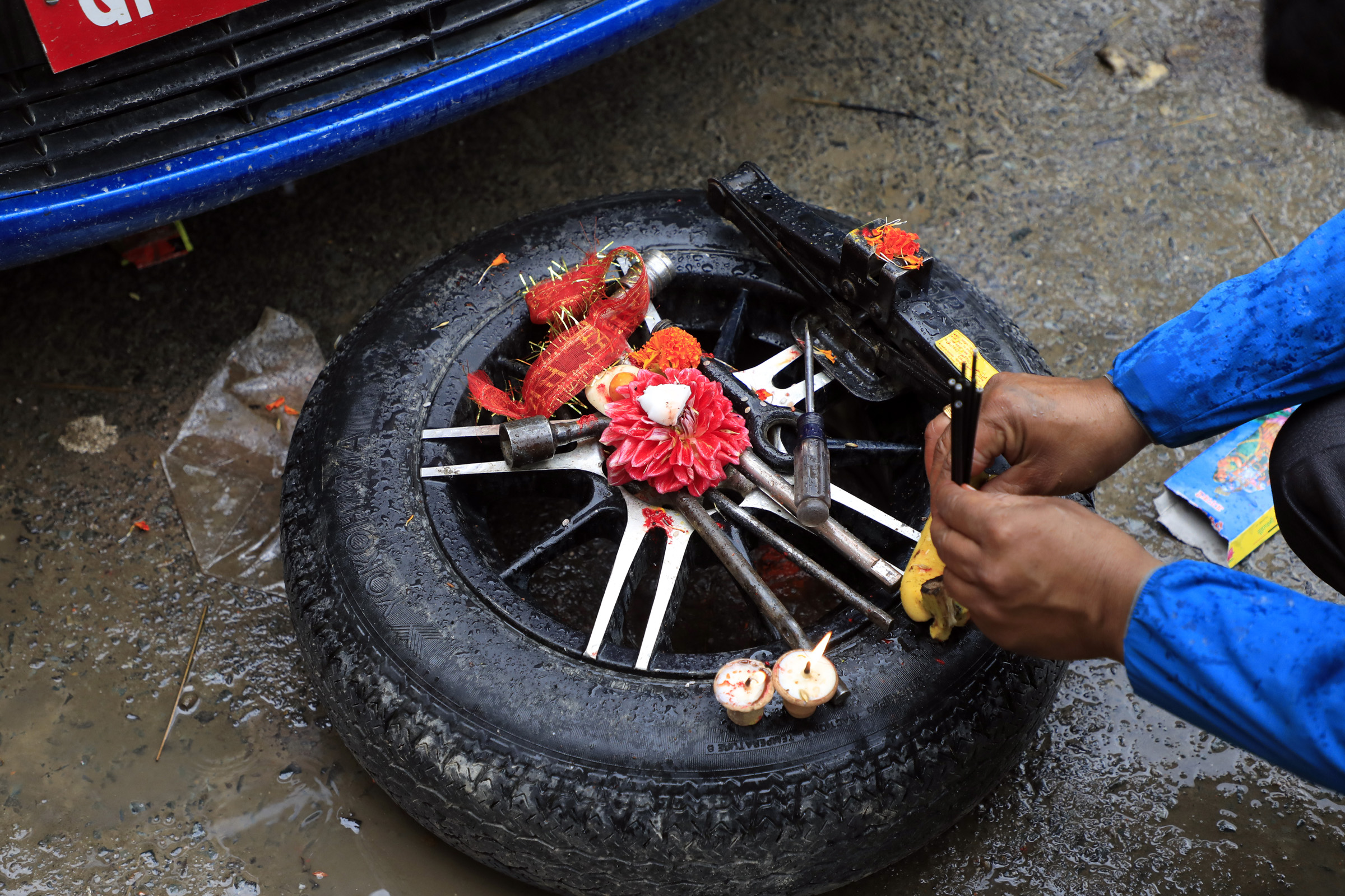 A garage worker worships his tools in Mahalaxmisthan, Lalitpur on the occasion of Vishwakarma Puja on Wednesday for a better future, safe working conditions and success. Hemanta Shrestha/TKP