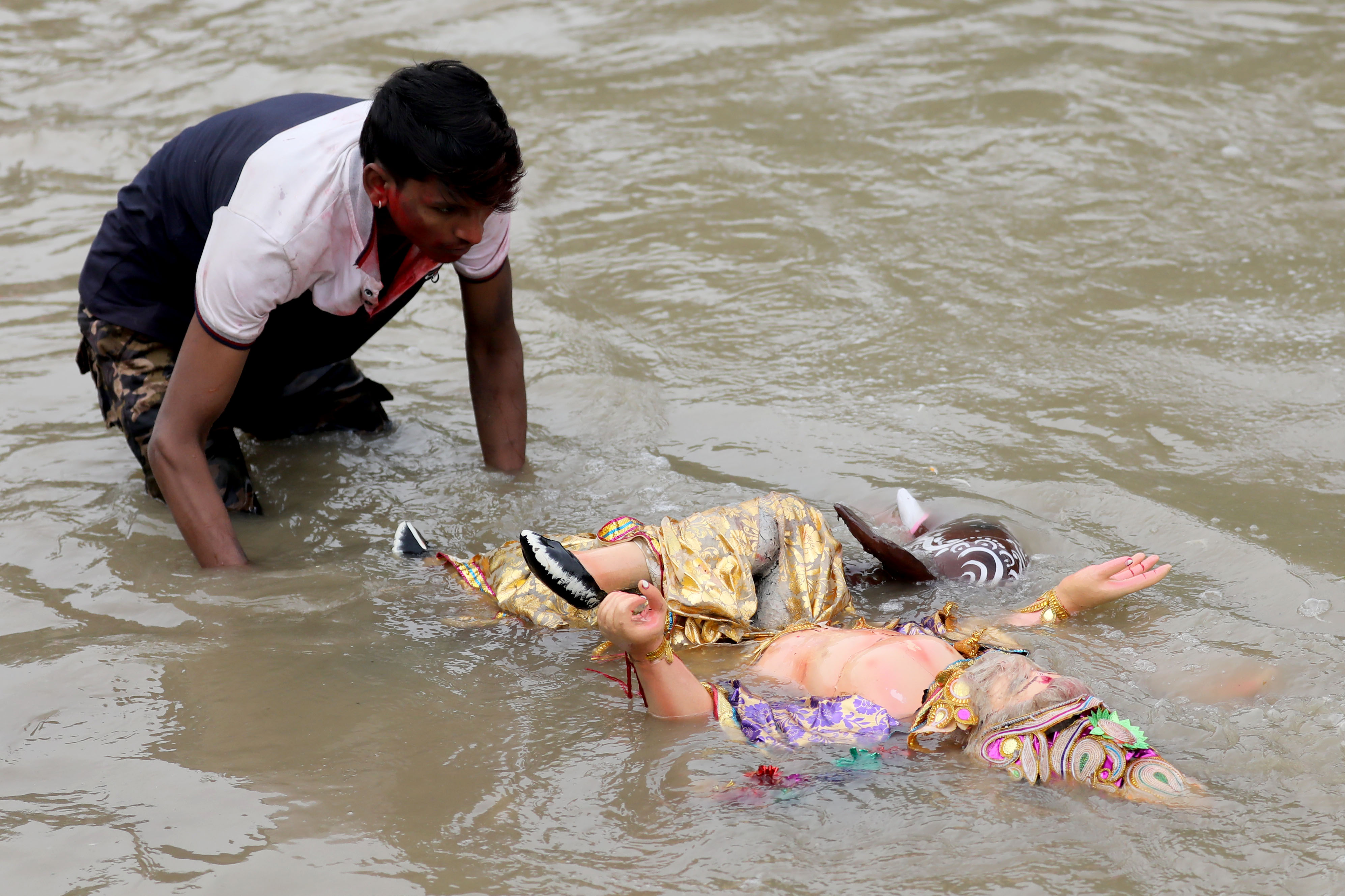 A man immerses the idol of Hindu god Bishwakarma in the Bagmati river in Kathmandu on Thursday. Bishwakarma is regarded as the main craftsman and architect of gods. Elite Joshi/TKP