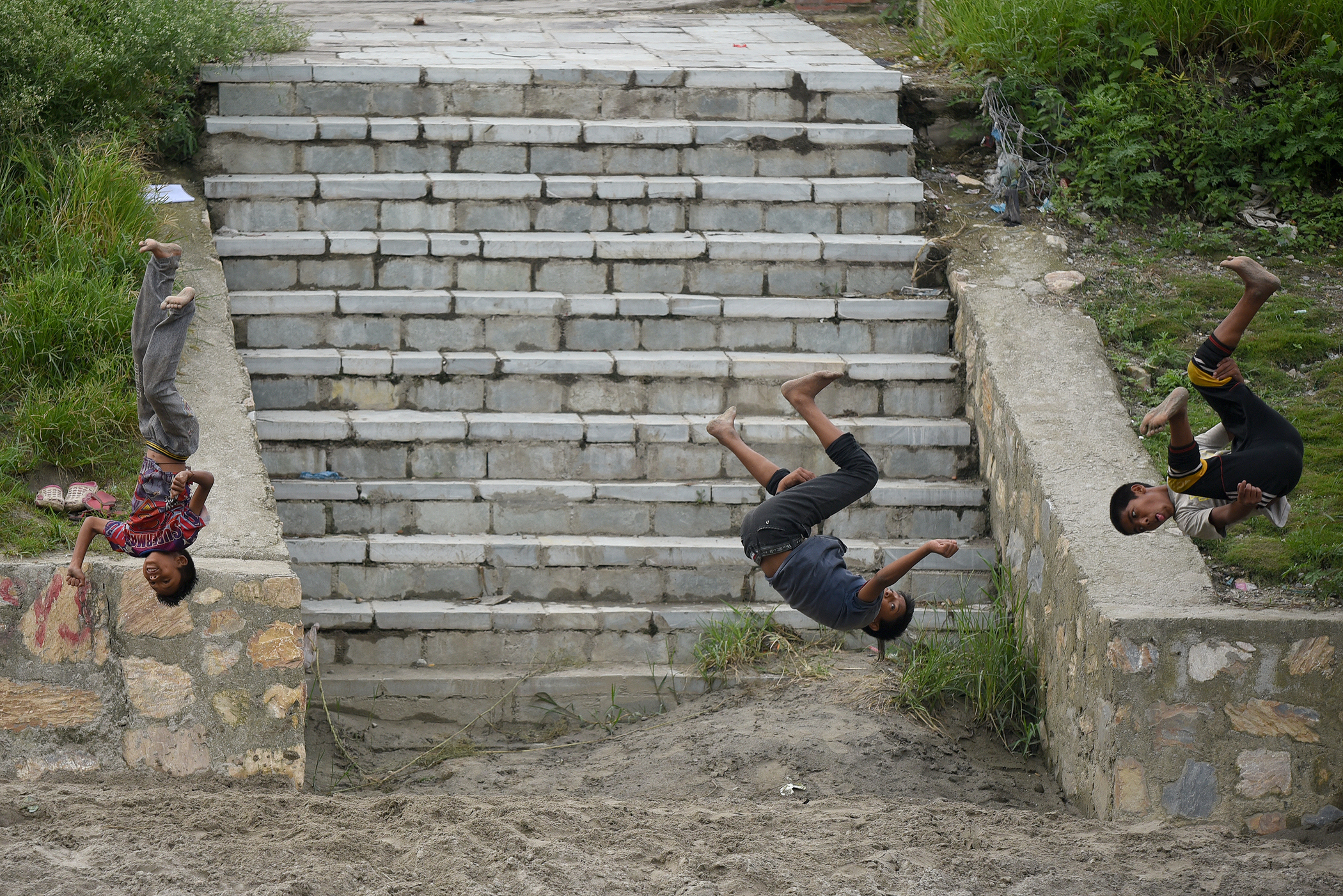 Children somersault on the banks of Bagmati River in Tilganga, Kathmandu. Angad Dhakal/TKP