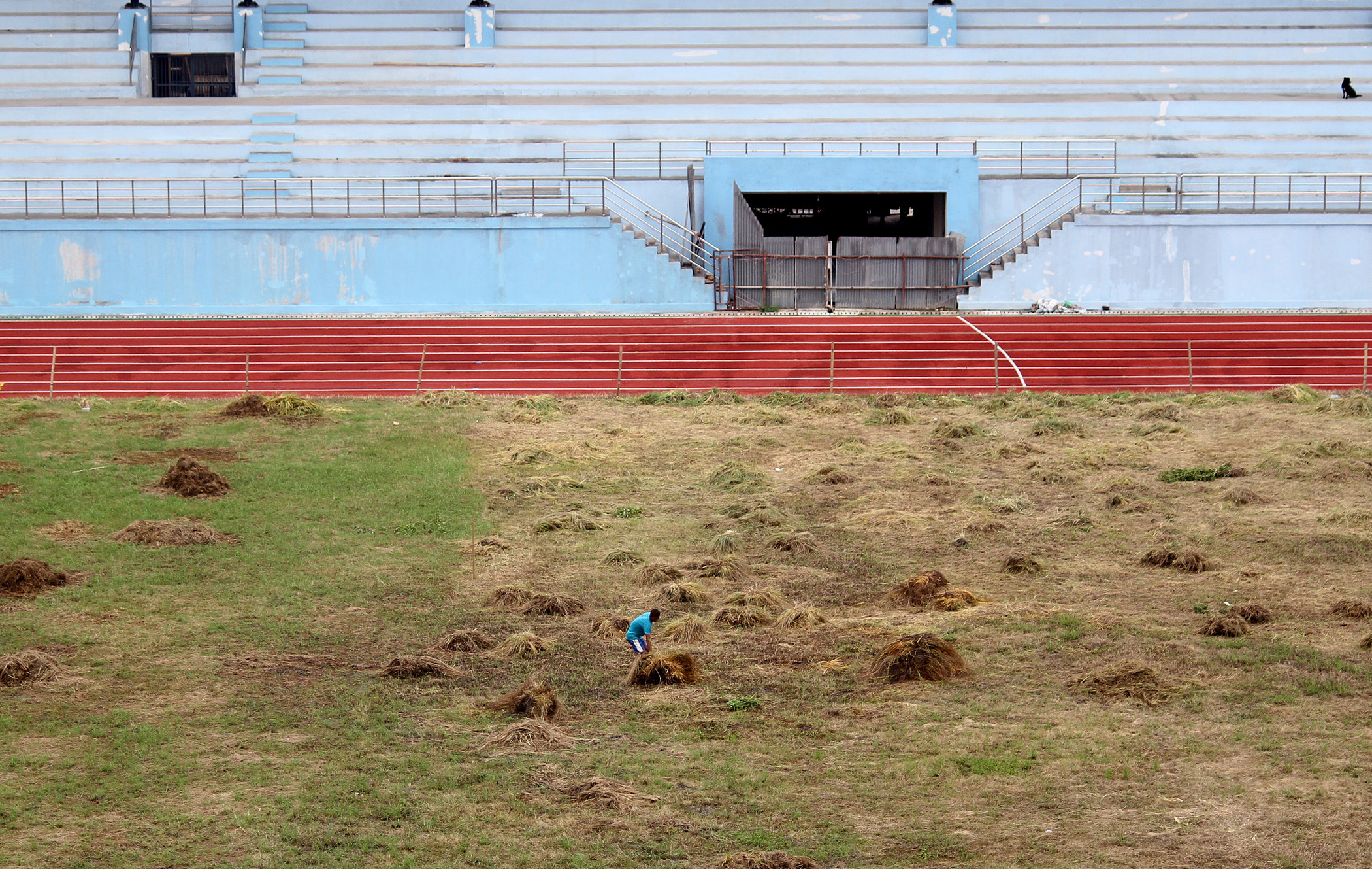 A groundsman works at the Dashrath Stadium football pitch in Tripureshwor, Kathmandu, on Friday. Beeju Maharjan/TKP
