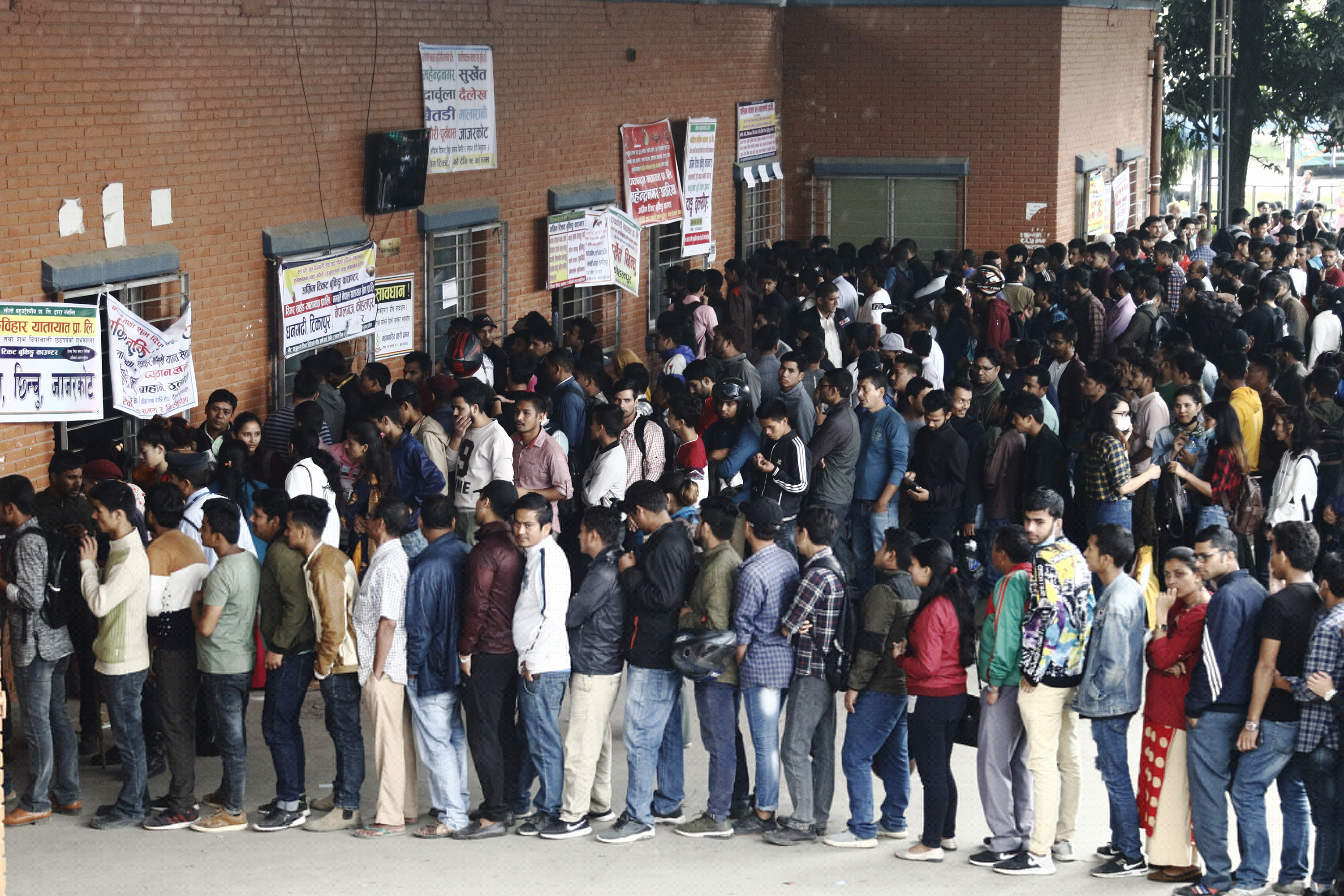People stand in queues to book tickets for their Dashain travel home, at New Bus Park in Gongabu, Kathmandu, as bookings opened on Sunday. Keshav Thapa/TKP