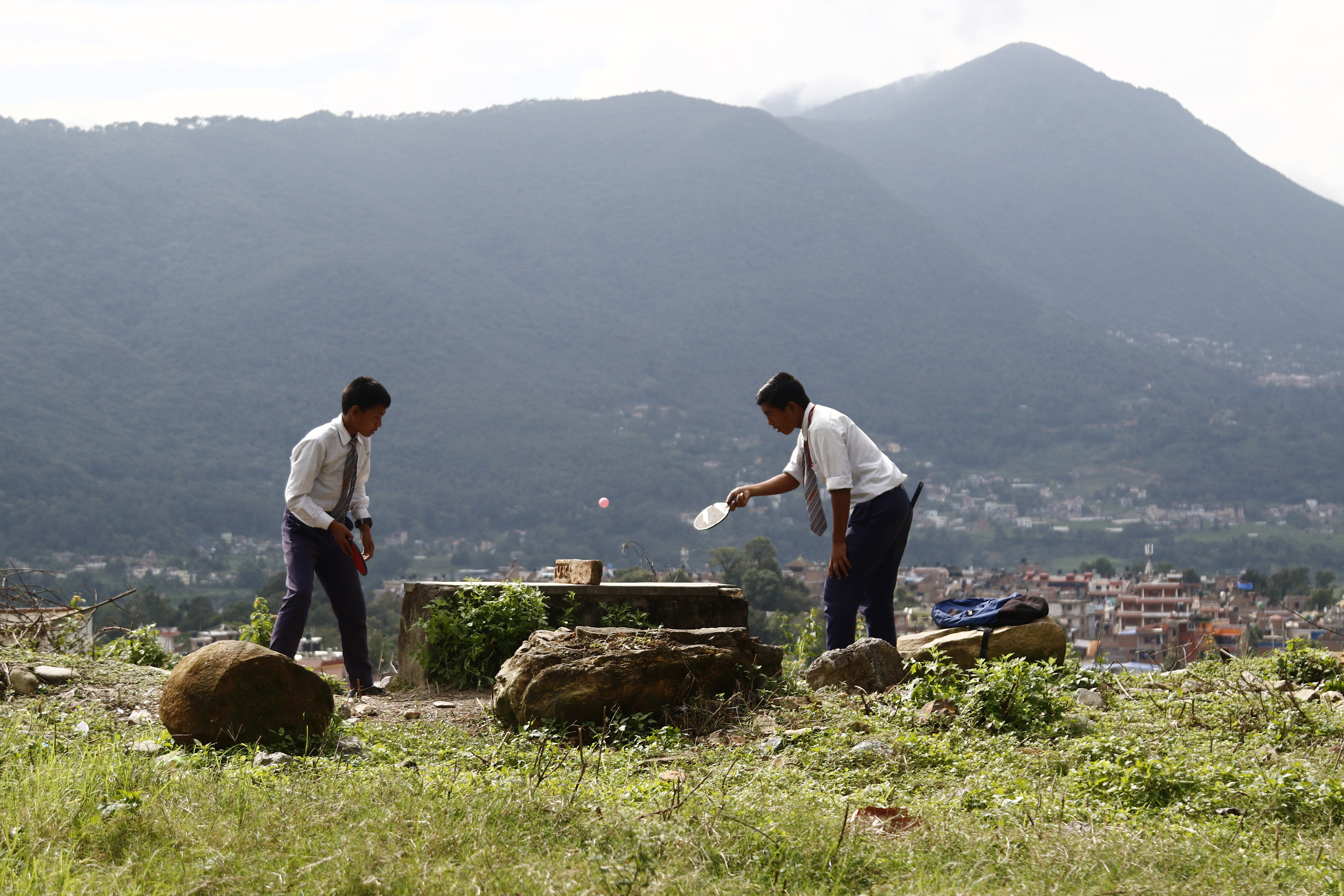 Students play table tennis on a concrete bench after school in Chayasikot, Lalitpur on Monday. Keshav Thapa /TKP