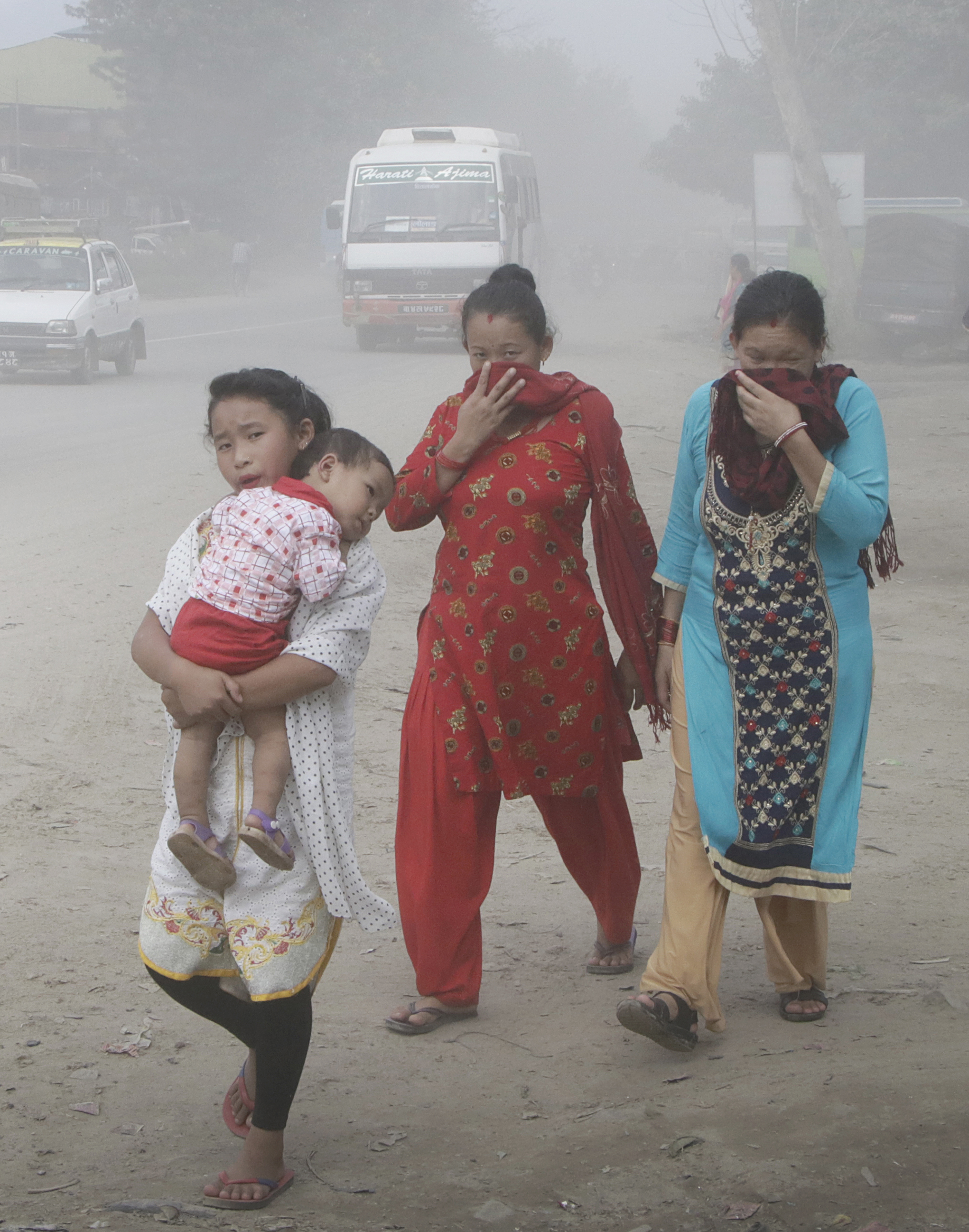 Pedestrians cover their faces as they walk on a dusty road section in Balaju on Tuesday. Anish Regmi/TKP