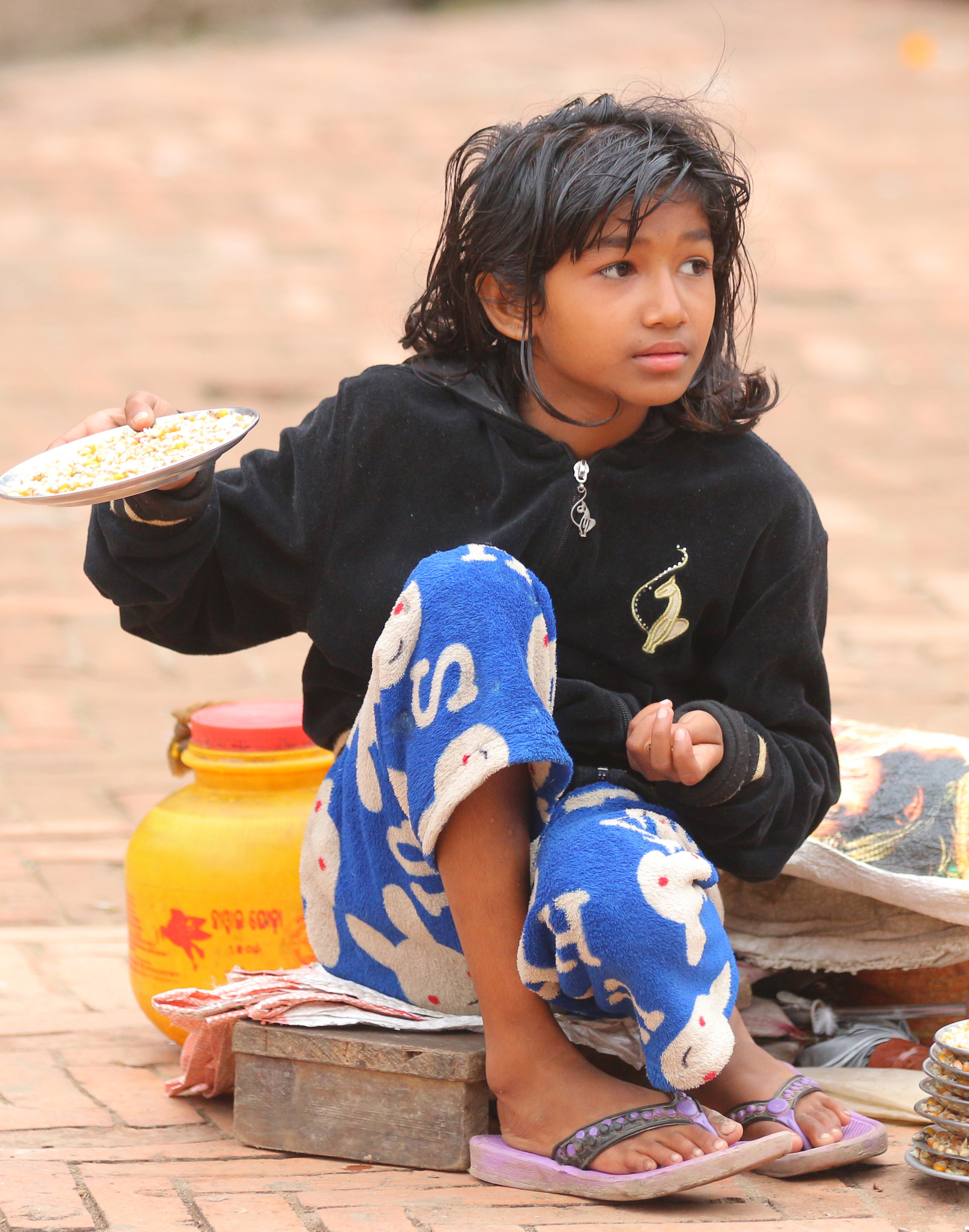 A young girl sells pigeon feed to customers at Patan Durbar Square on Friday. Elite Joshi/TKP