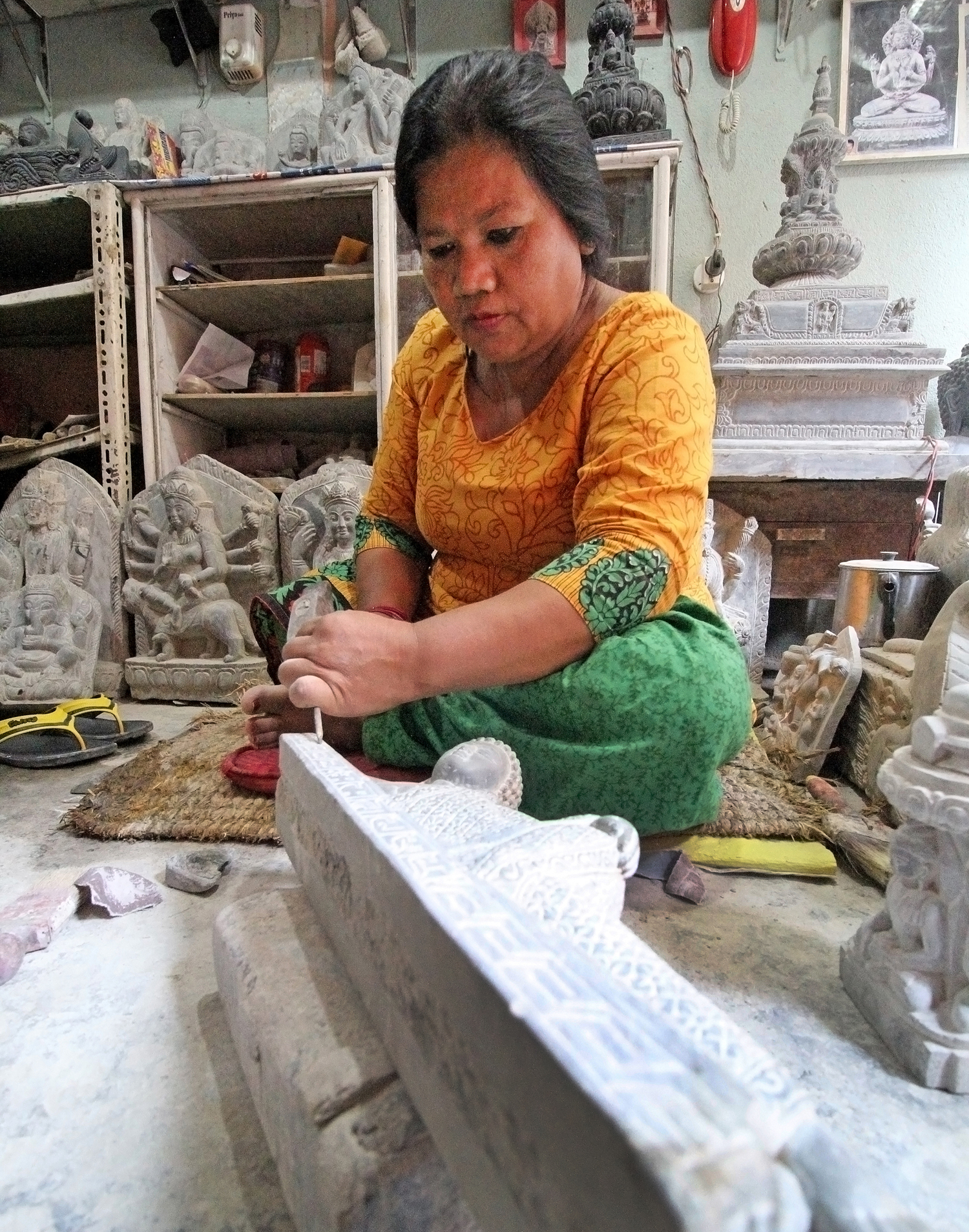 Meena Bajracharya sculpts a stone statue at a workshop in Bhinchebahal, Lalitpur. Bajracharya has been sculpting statues for the past 30 years. Beeju Maharjan/TKP