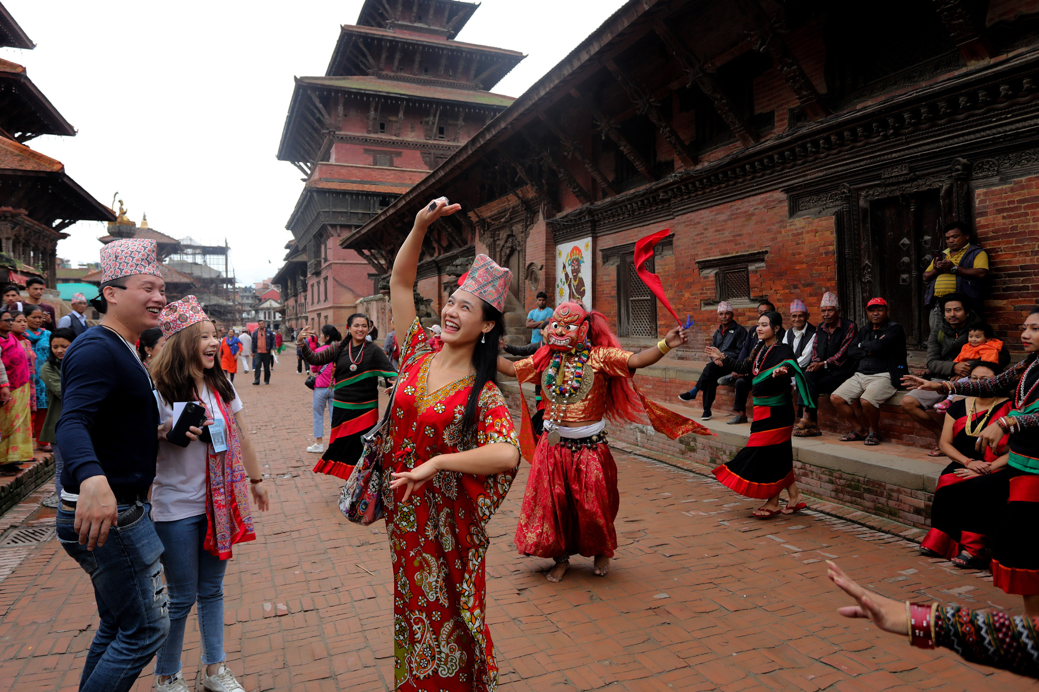 Foreigners participate in a cultural event held to mark the 40th World Tourism Day at Patan Durbar Square in Lalitpur on Friday. Elite Joshi/TKP