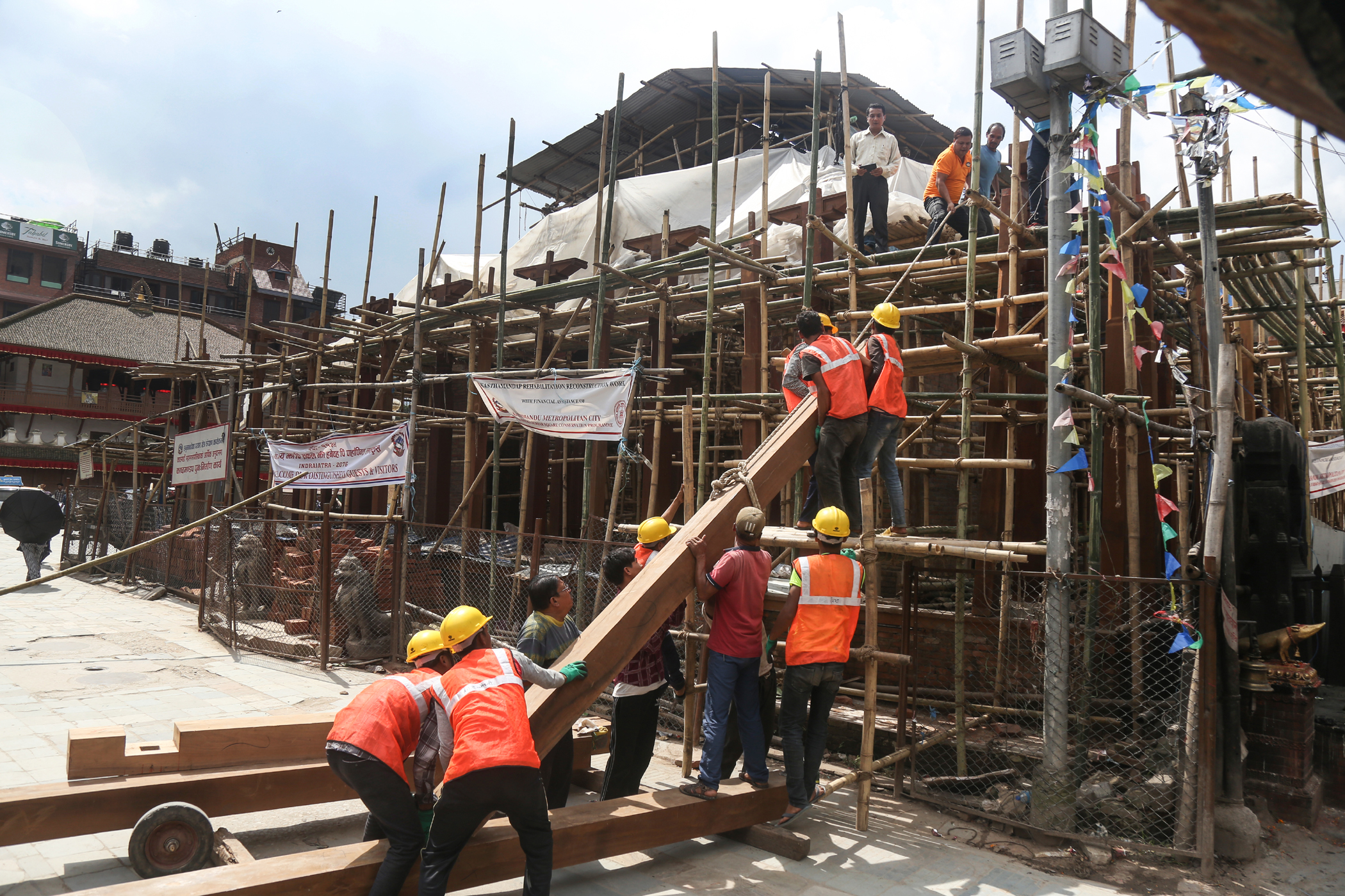 Reconstruction work of the Kasthamandap temple, which was reduced to rubble in the 2015 earthquakes, is being carried out in full swing in Kathmandu. Kabin Adhikari /TKP
