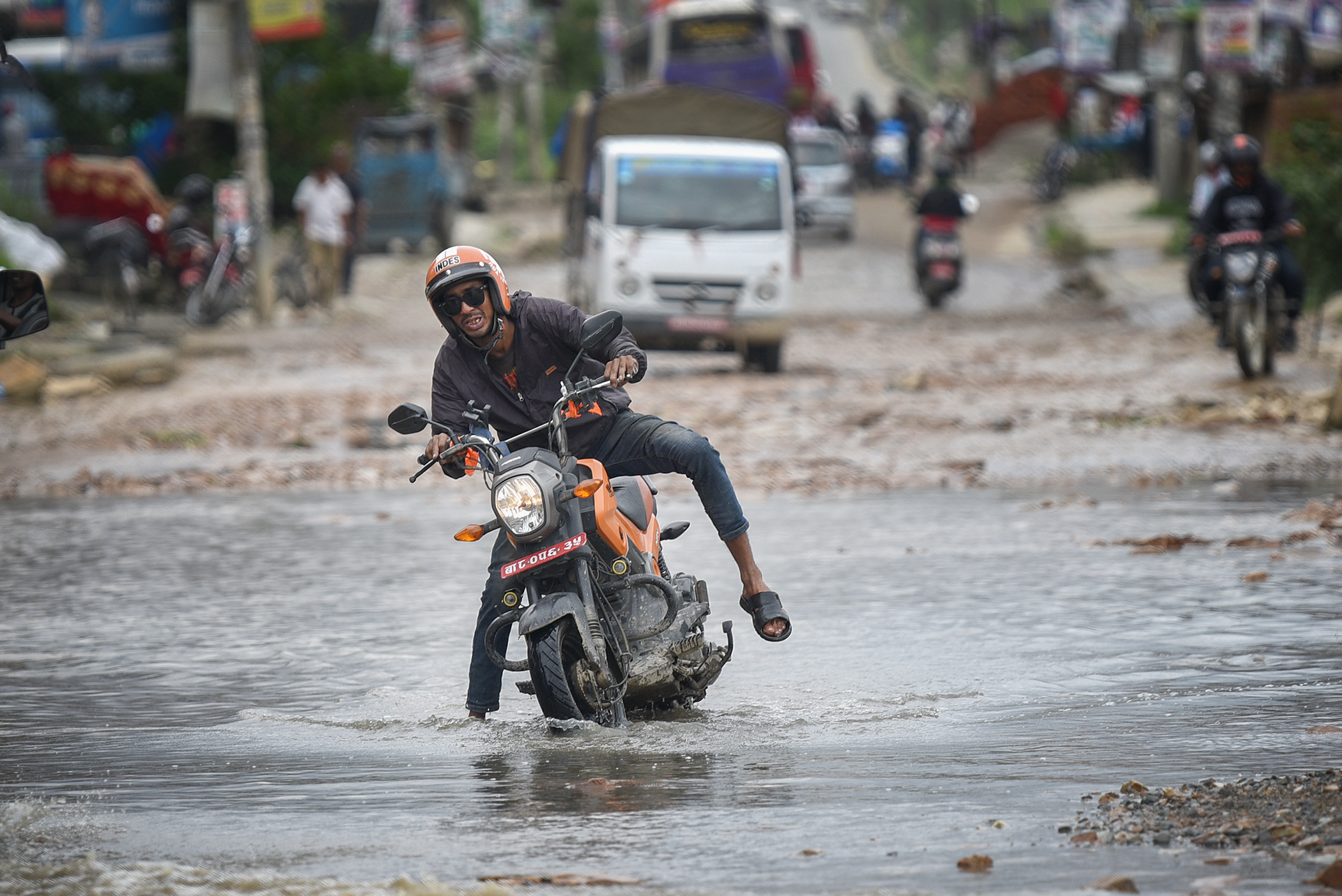 A man struggles to keep his two-wheeler upright in a waterlogged street in Nikosera, Bhaktapur. The condition of road stretch has remained pathetic ever since it was built. Angad Dhakal /TKP
