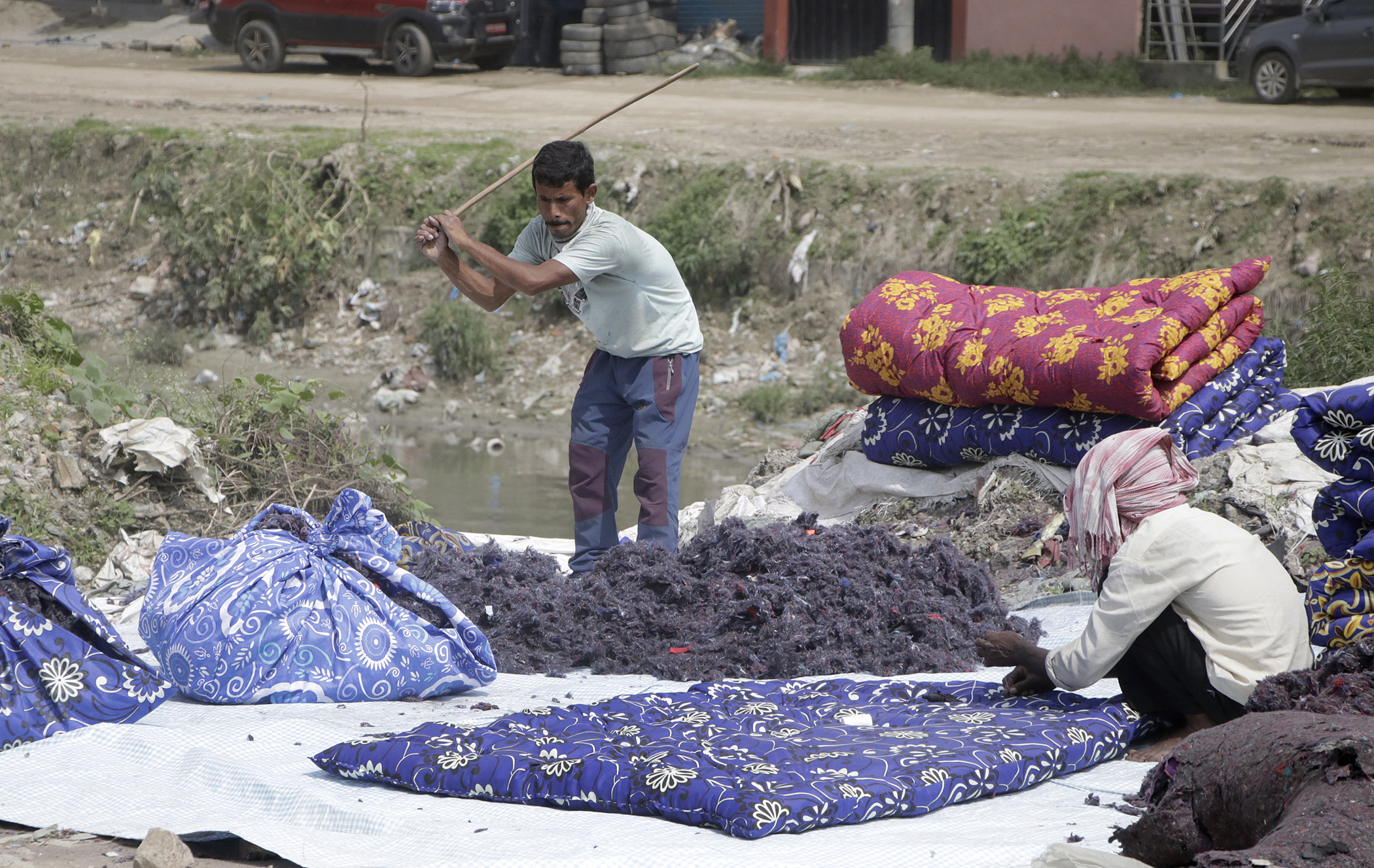 Two men prepare mattresses in Nayapul, Kathmandu, on Tuesday. Anish Regmi/TKP