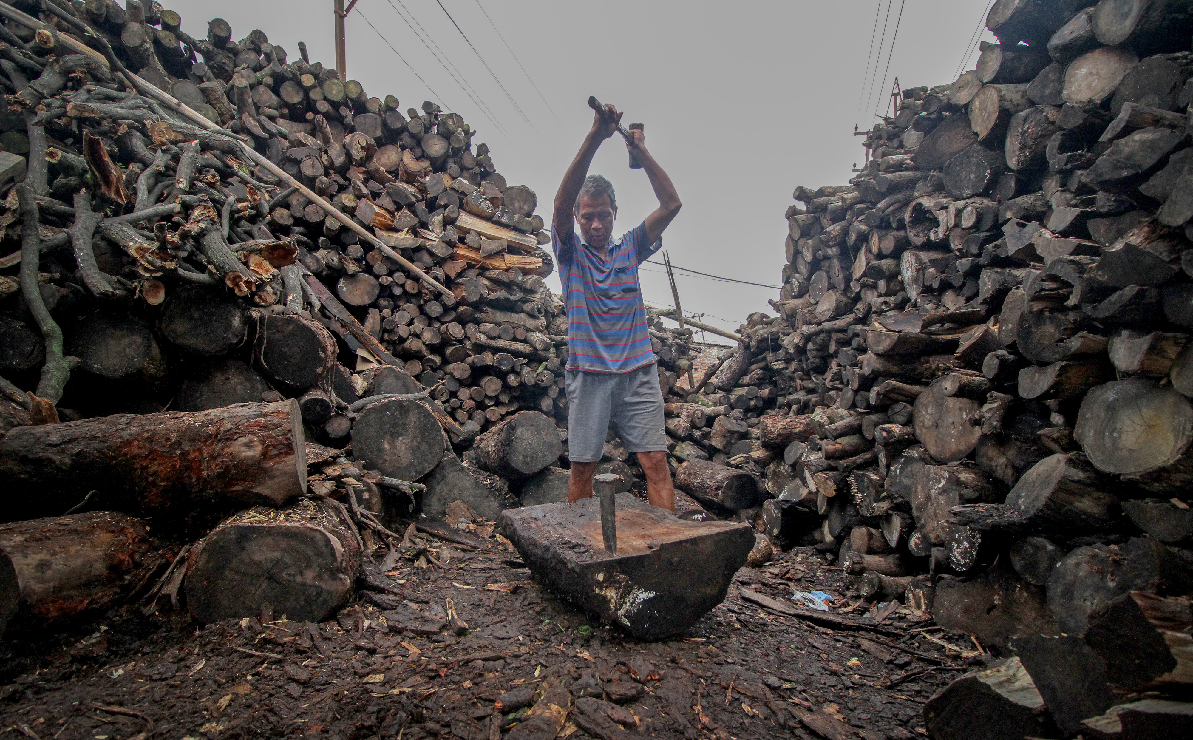 Gyan Bahadur Syanthan cuts logs at a lumber mill in Teku, Kathmandu. He has been cutting logs for a living for the past 25 years, and earns Rs 1,200 every day. Beeju Maharjan /TKP