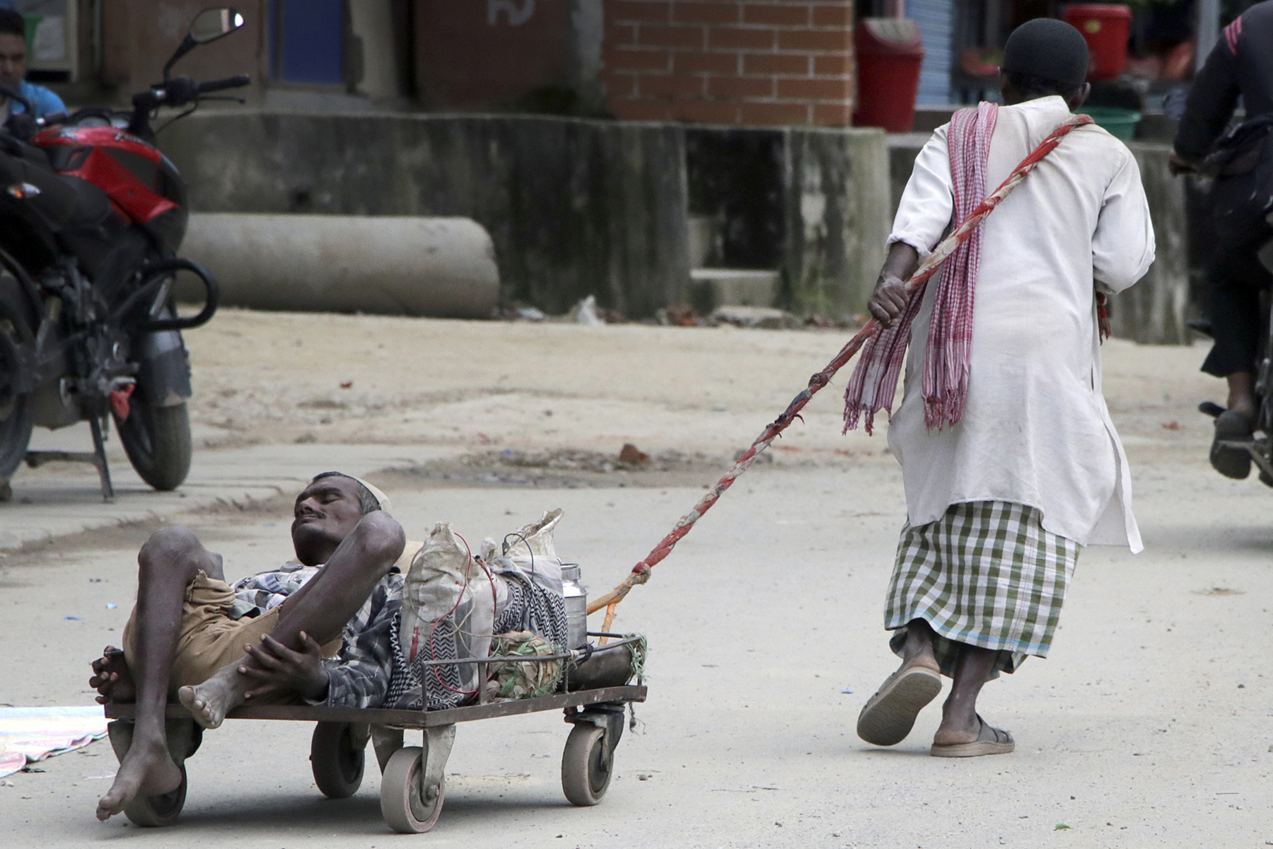 A man pulls a person with disability on a cart as they go begging around at Bhaisepati in Lalitpur on Monday. Anish Regmi/TKP