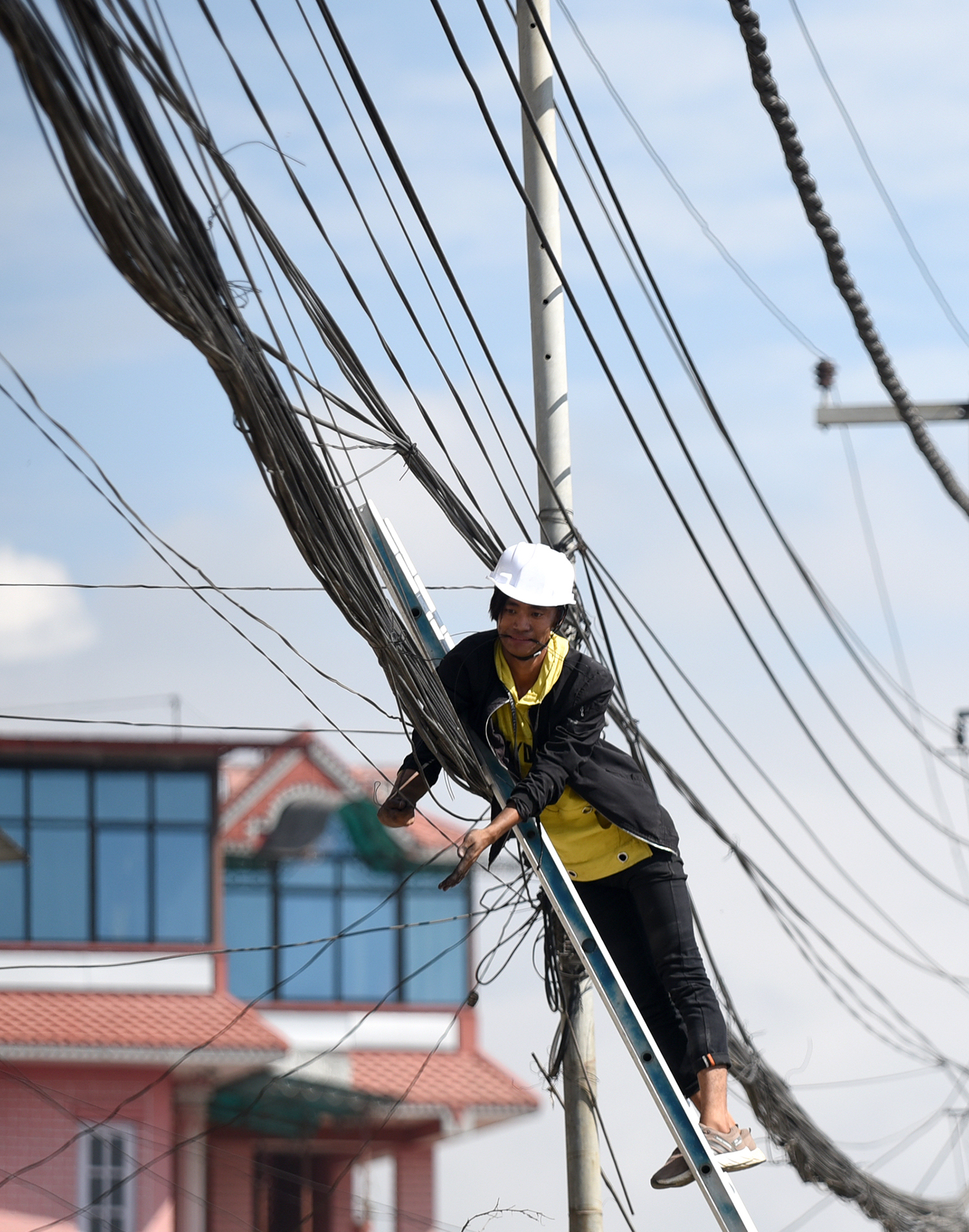 A worker untangles a mess of wires in Chakrapath, Kathmandu, on Monday. Angad Dhakal/TKP